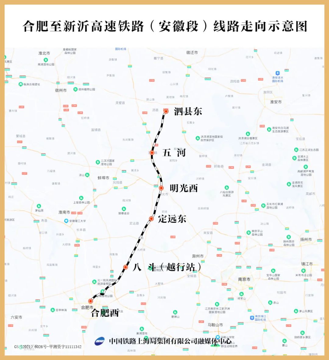 合新高铁起自安徽省合肥市,途经定远县、凤阳县、明光市、五河县、泗县,以及江苏省泗洪县、宿迁市市区,终至新沂市,线路全长约324公里。其中安徽段新建线路198公里,设计时速350公里,共设泗县东、五河、明光西、定远东、八斗(越行)、合肥西6座车站,控制性工程为淮河特大桥。