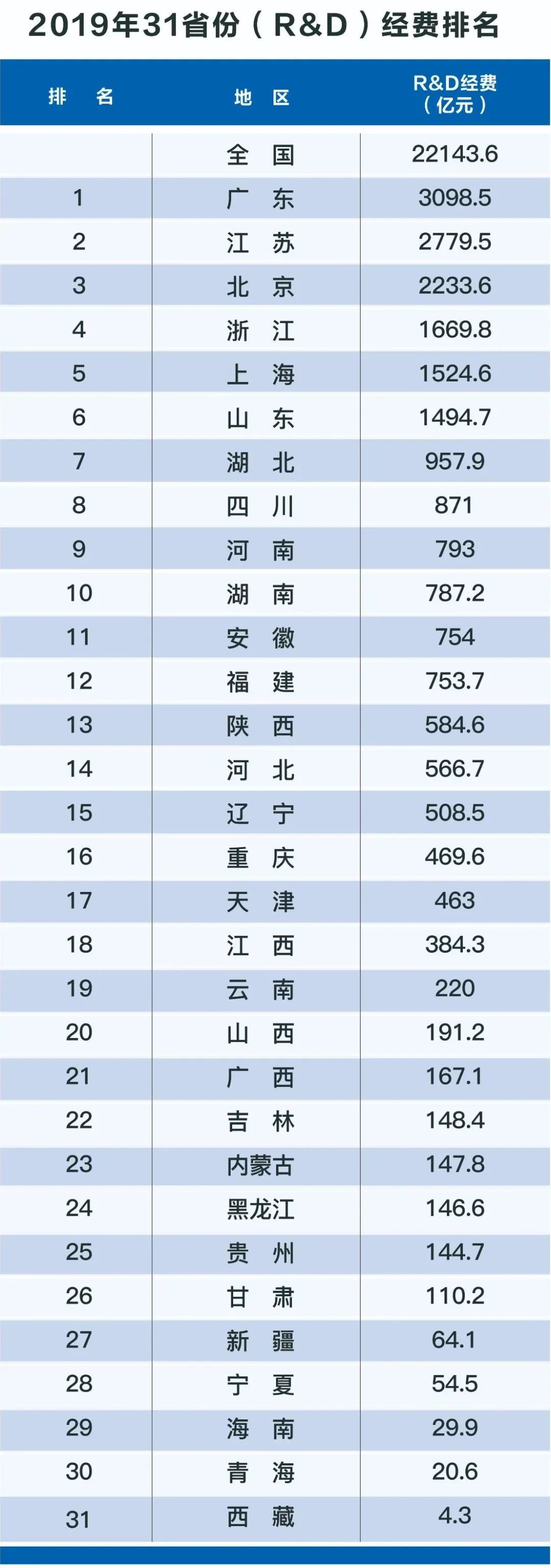 从研发经费总量来看,2019年,广东一马当先,成为全国唯一突破3000亿元大关的省份,达到3098.5亿元,科研大省当之无愧。