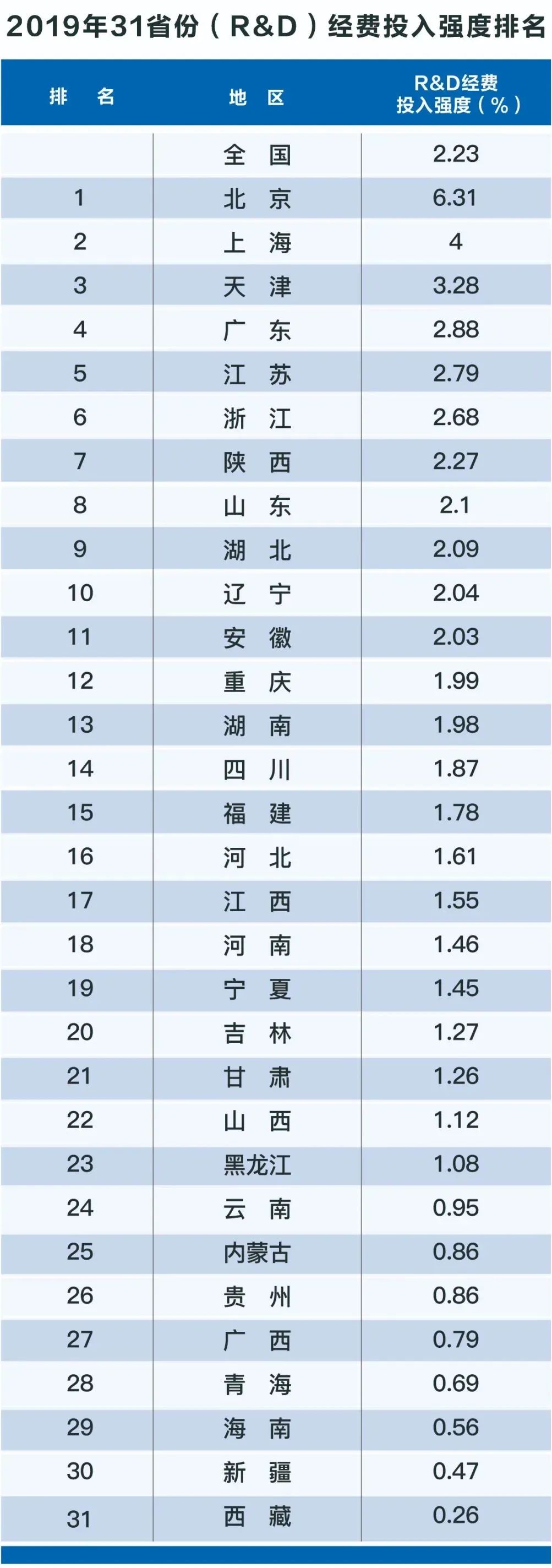有7个省市超过了全国2.23%的研发投入强度,分别是北京、上海、天津、广东、江苏、浙江和陕西。
