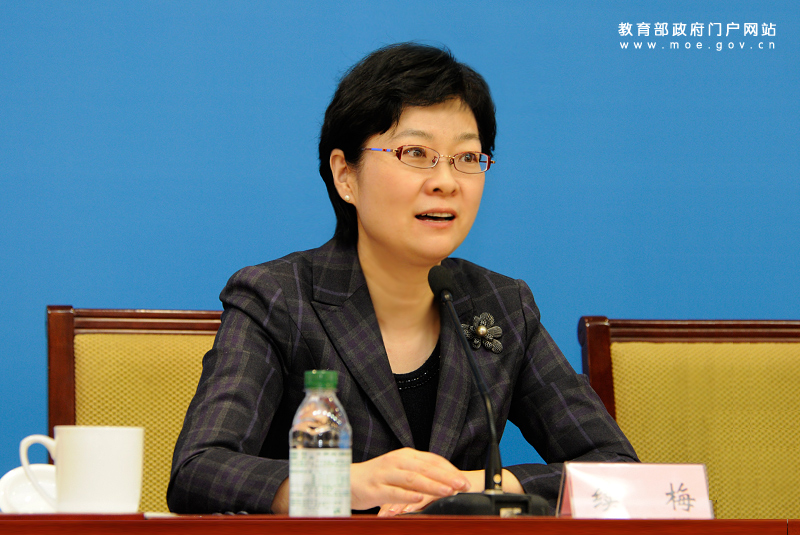 教育部新闻发言人续梅主持发布会。(张珏瑛/摄)