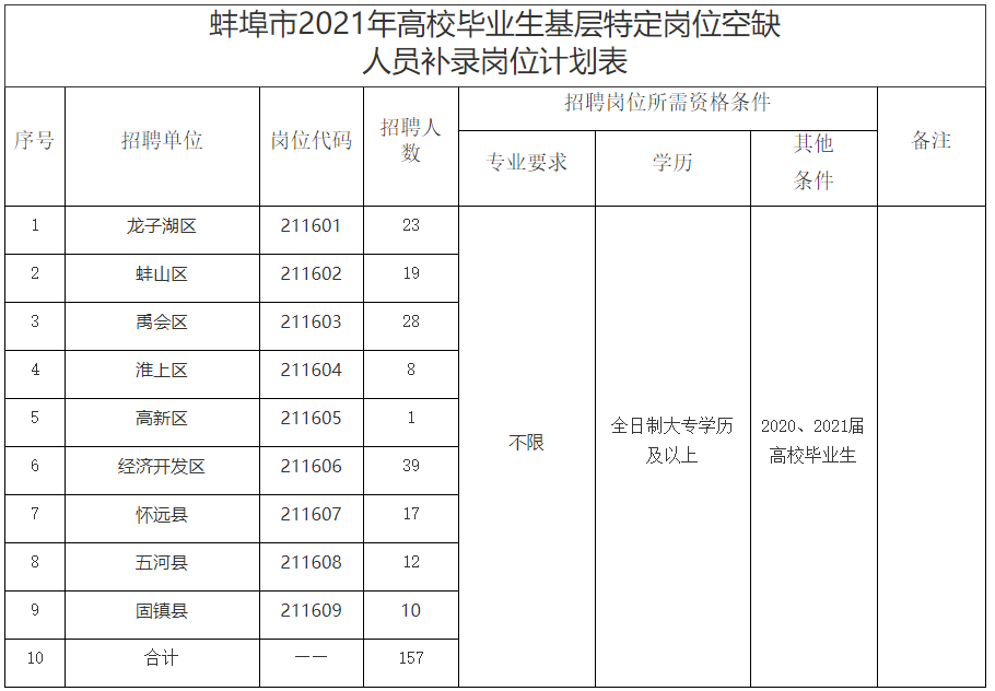 此次计划补录157人,其中:龙子湖区23人、蚌山区19人、禹会区28人、淮上区8人、高新区1人、经济开发区39人、怀远县17人、五河县12人、固镇县10人。