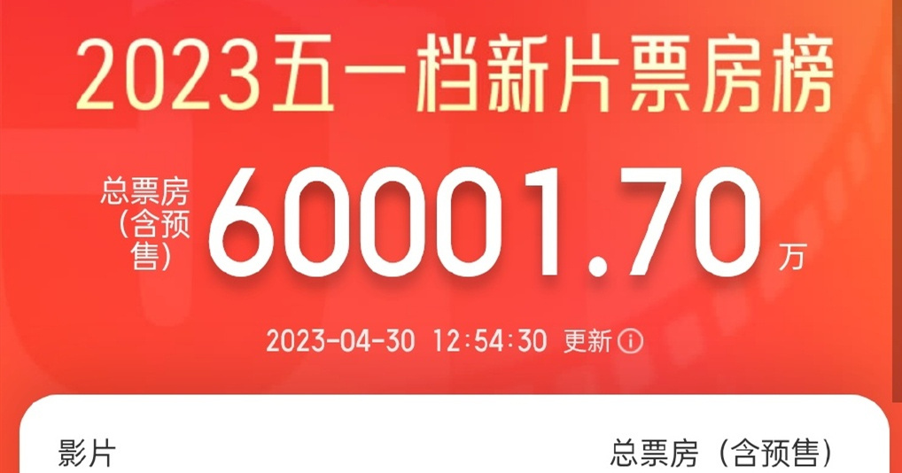 据猫眼专业版数据显示,截至4月30日12时54分,2023五一档新片总票房(含预售)突破6亿,《长空之王》以2.35亿的票房成绩领跑榜单,《人生路不熟》《这么多年》分别位列第二、第三。