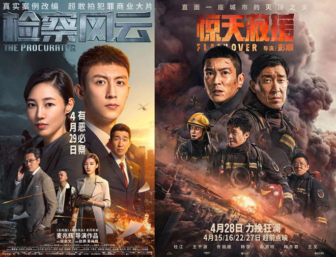 麦兆辉执导、黄景瑜、白百何主演的犯罪题材电影《检察风云》,彭顺执导、杜江、王千源、佟丽娅主演的灾难动作片《惊天救援》票房表现不相上下,分别以2523.46万、2324.05万位列第四、第五,与前三名的票房成绩出现严重断层。