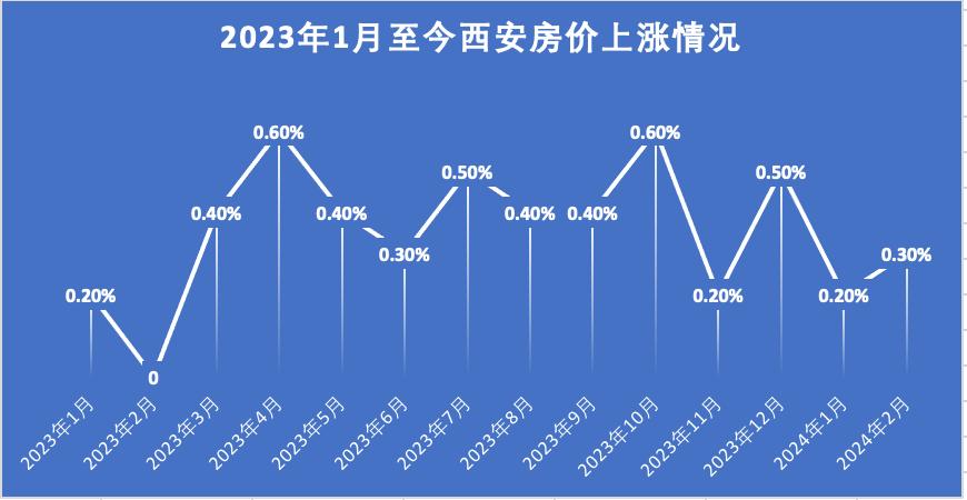 国家统计局西安调查队发布的数据显示,今年2月份,西安新建商品住宅销售价格环比上涨0.3%,涨幅比上月扩大0.1个百分点,已连续12个月保持上涨态势;同比上涨4.8%,涨幅比上月扩大0.3个百分点。3月份,西安房价涨幅为0.4%。