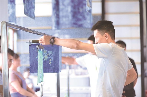游客在被誉为“蜡染之乡”的安顺旧州古镇体验蜡染艺术。 杨明亮 摄 (贵州图片库发)