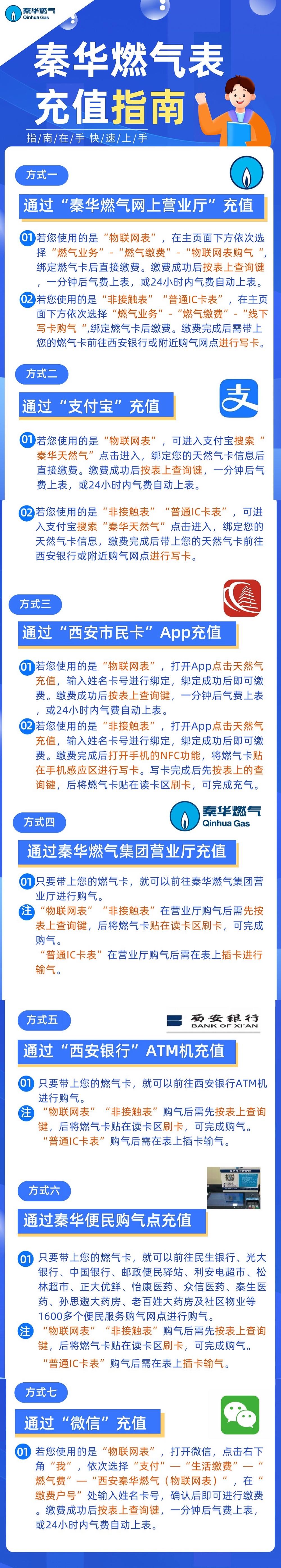 ▲“指南在手,快速上手”秦华燃气表充值指南来啦~市民们可通过这七种充值方式进行天然气充值,快来看看吧。