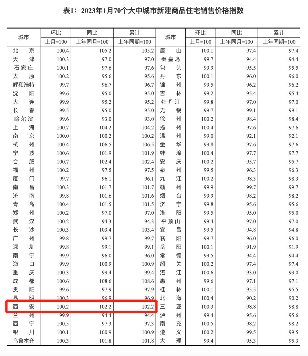 据国家统计局发布的1月份70个大中城市商品住宅销售价格变动情况,1月份,70个大中城市中商品住宅销售价格环比上涨城市个数增加;一线城市商品住宅销售价格环比转涨、二三线城市环比降势趋缓,一线城市商品住宅销售价格同比上涨、二三线城市同比下降。1月份,西安新建商品房价格环比上涨0.2%,同比上涨2.2%。