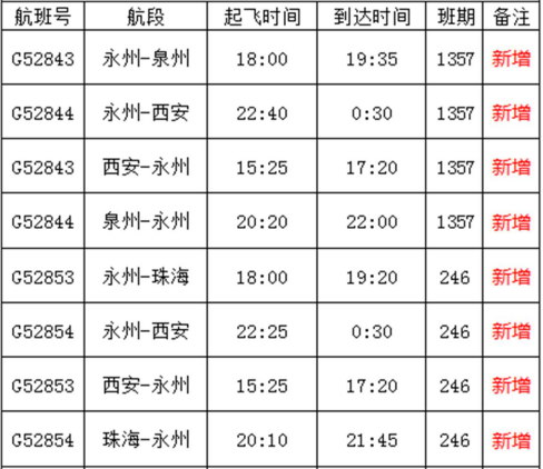 为了方便永州市民出行,自2018年10月28日冬春换季后永州新增3条航线:永州-西安(每天一班),永州-珠海(每周二四六),永州-泉州(每周一三五日),原有航线:永州-北京(每天一班),永州-上海(每周一三四日),永州-昆明(每周一三四日),永州-重庆(每天一班),永州-海口(每天一班),永州-福州(每周二四六),永州-贵阳(每周二四六)。换季后永州航线将增加到10条!为永州百姓航空出行提供更多的选择。