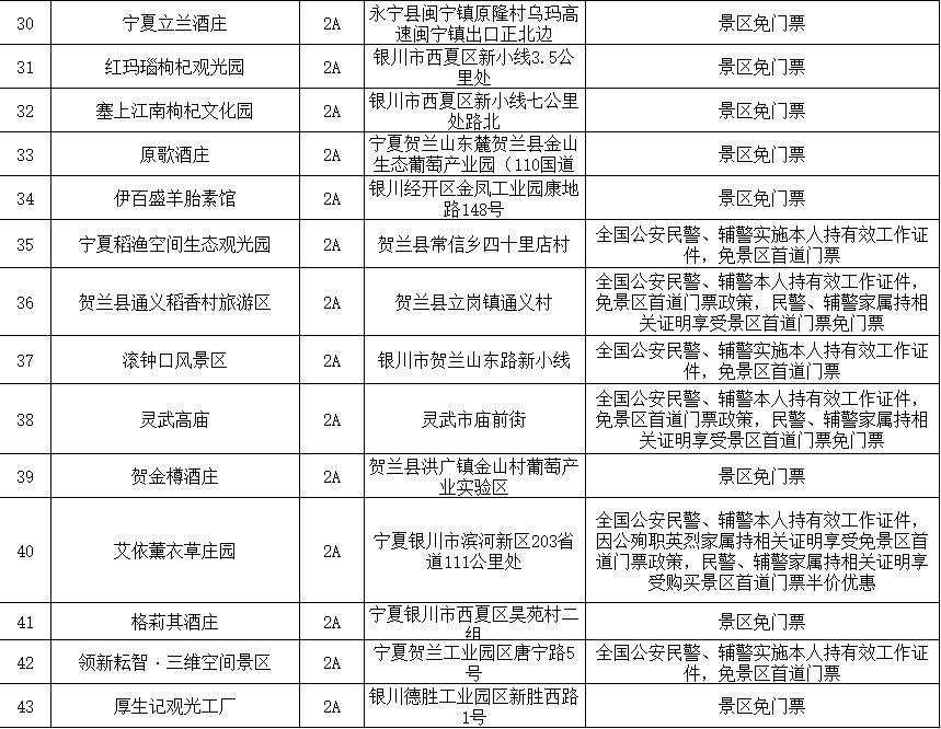 银川市各A级旅游景区面向全国公安民警辅警优惠政策汇总表: