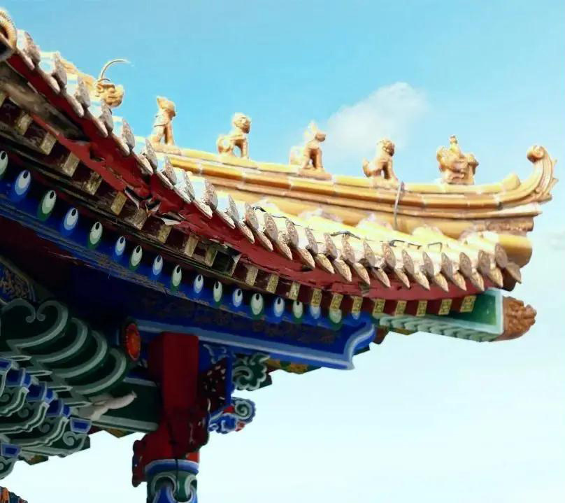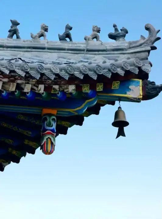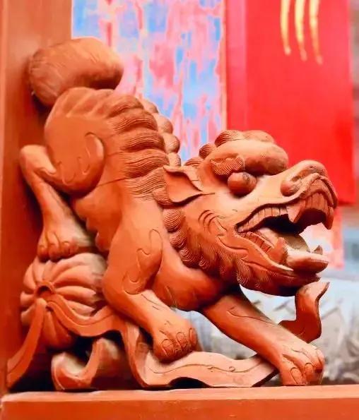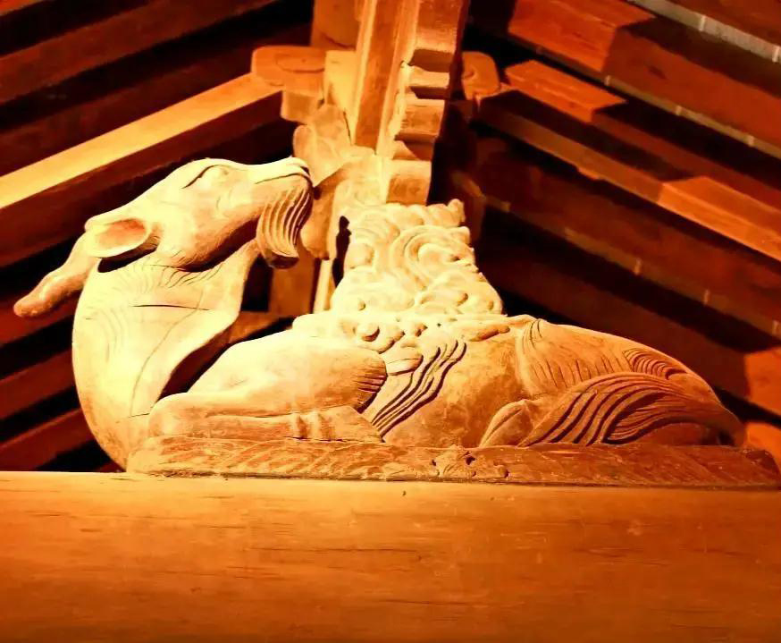 戏楼房脊上分别排列着五个蹲兽,依次为:狻(suān)猊(ní)、斗牛、獬(xiè)豸(zhì)、凤、狎(xiá)鱼。此为镇脊之神兽,起吉祥、装饰和保护建筑的三重功能。檐下的太平之象伸出象鼻,向上抬起,寓意吉祥美满,为祥瑞之兆。
