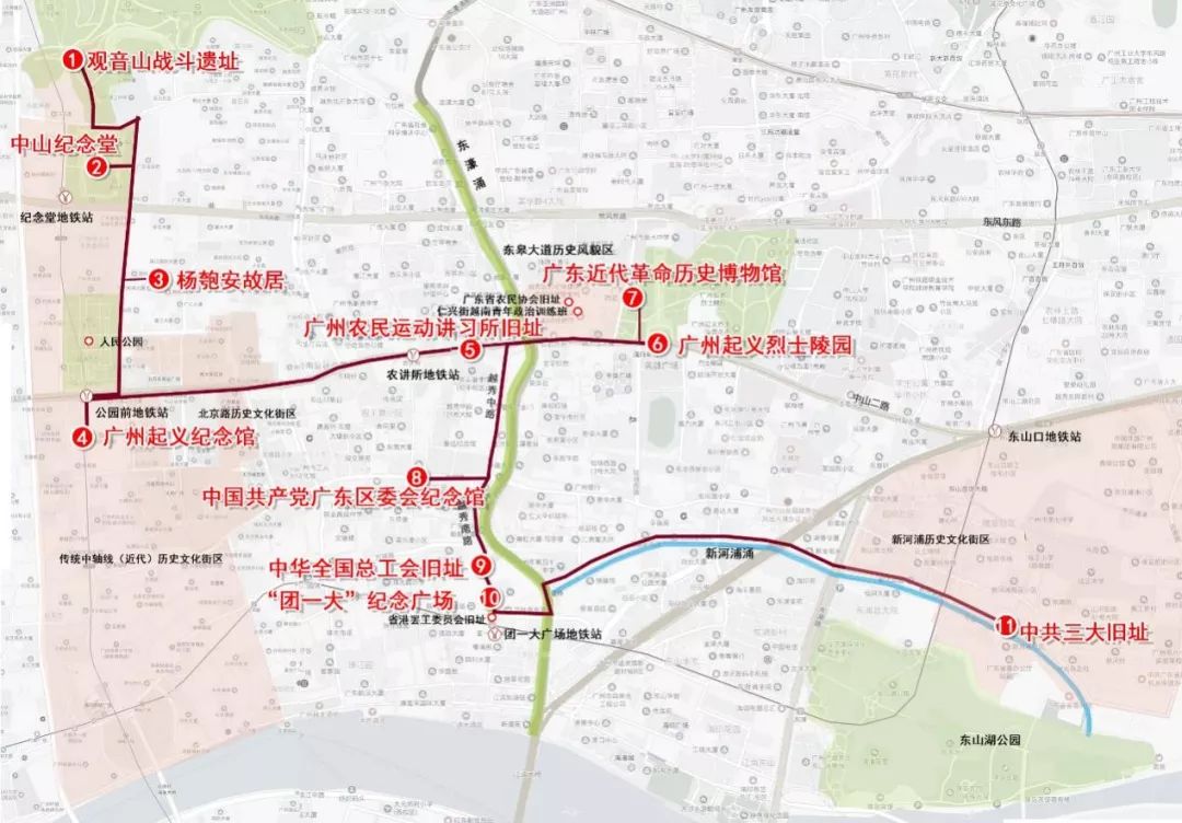 红色基因步径全长6.6公里,串联了广州11个重要的红色旅游景点,从观音山战斗遗址出发,途经中山纪念堂、杨匏安旧居、广州起义纪念馆、广州农民运动讲习所、广州起义烈士陵园、广东革命历史博物馆、中共广东区委旧址纪念馆、中华全国总工会旧址、“团一大”纪念广场,最终到达中共三大会址纪念馆。