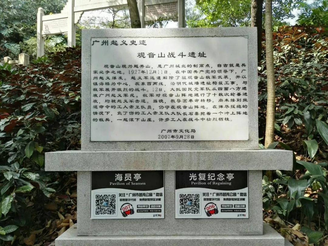 观音山就是现在的越秀山。1927年12月11日,中国共产党领导了广州起义,起义军解除了驻观音山敌军武装,并在此与敌军展开了激烈战斗。为纪念这次的战斗,在此设立纪念碑。越秀公园如今已经成为一个综合性公园,除了保存多个文物和历史遗迹,也建设了文体游乐场所。