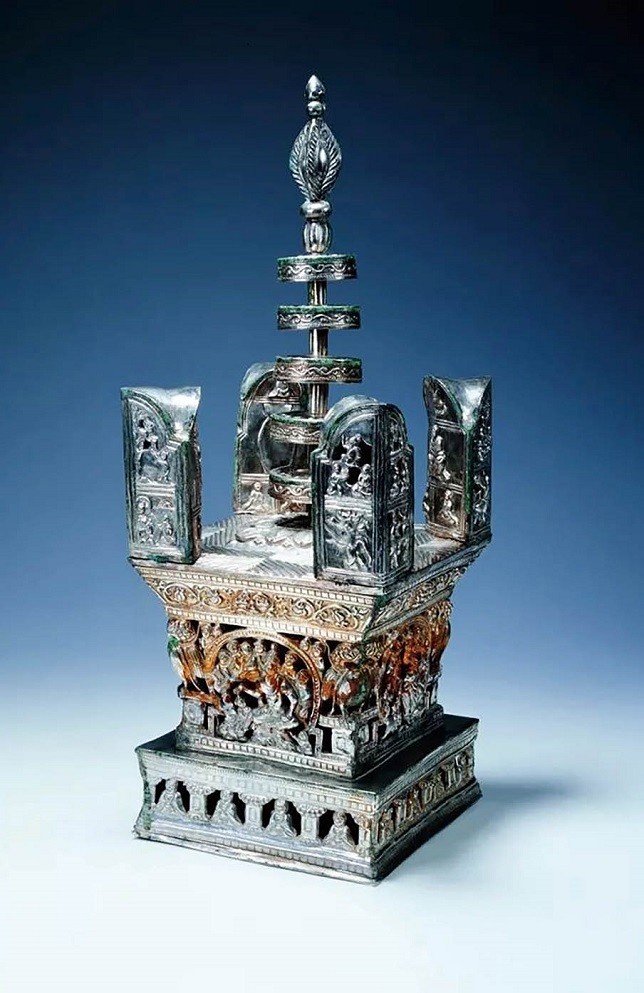 鎏金纯银阿育王塔,通高36厘米。由基座、塔身、山花蕉叶、塔刹四部分组成,塔身方形,四面镂刻佛本生故事画面,每面一个,分别为萨埵太子舍身饲虎、月光王施宝首、尸毗王割肉贸鸽、快目王舍眼。