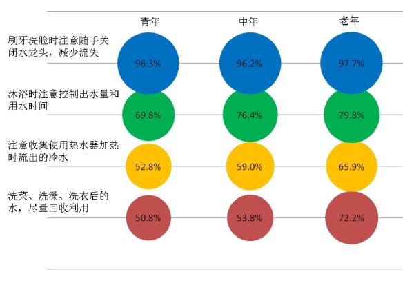 从年龄看,采取上述节水行为的老年市民(61周岁及以上,下同)比例均高于中年市民(41-60周岁,下同),中年市民均高于青年市民(18-40周岁,下同)。同时具有上述4种节水行为的老年、中年和青年市民的比例分别为42.7%、31.2%和25.4%。可见,年龄较大的爷叔、阿姨节水意识更强,更注意节约用水,而“老人家”勤俭节约的作风更值得年轻人学习。