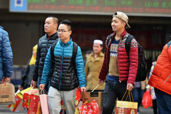 经过一年的打拼,在外漂泊的人们踏着匆匆的步履,赶在除夕华灯上、万家团圆时回到自己的家乡,与亲朋团聚。春节回家是流传至今的传统,更是一次精神的履约。2月18日,几位旅客提着年货走出兰州火车站出站口。新华社记者 陈斌 摄