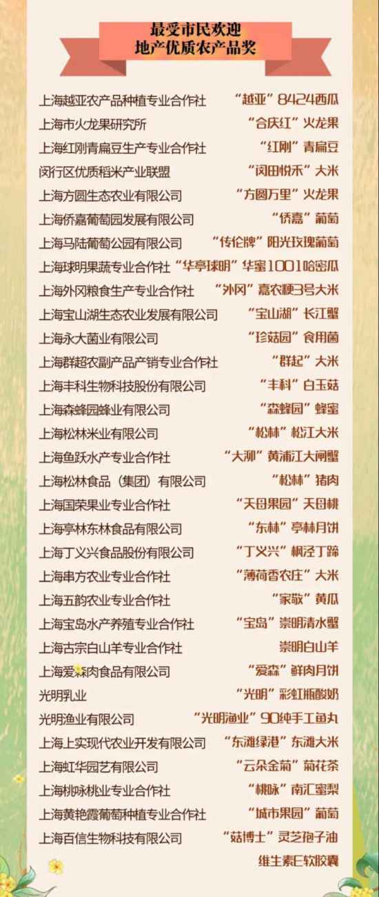 事实上,在今年丰收节期间,市农业农村委组织市民代表品鉴体验了来自不同区的特色农产品,选出了上海越亚农产品种植专业合作社“越亚”8424西瓜等32家单位产品“最受市民欢迎地产优质农产品奖”。这份获奖名单或许能成为市民和游客市郊游“买买买”的参考。