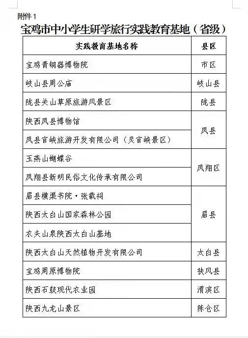 近日,市教育局、市文化和旅游局、市文物局按照省、市研学教育基地评选要求,采取自愿报名、县区推荐、实地考察、专家评审等方式,评选出了宝鸡市首批中小学生研学旅行实践教育基地。至此,我市现有省、市研学旅行实践教育基地38家(其中省级14家、市级24家)。