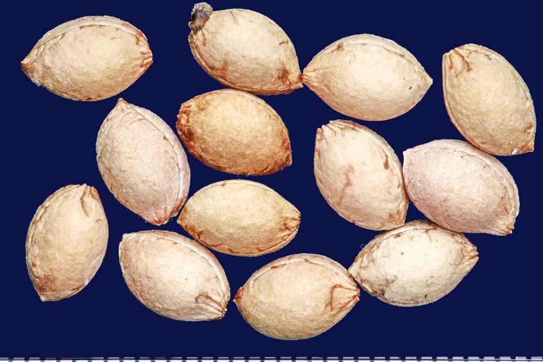 核果近球形,红色;核椭圆形,黄褐色,表面除棱脊两侧有纵沟外,无棱纹。