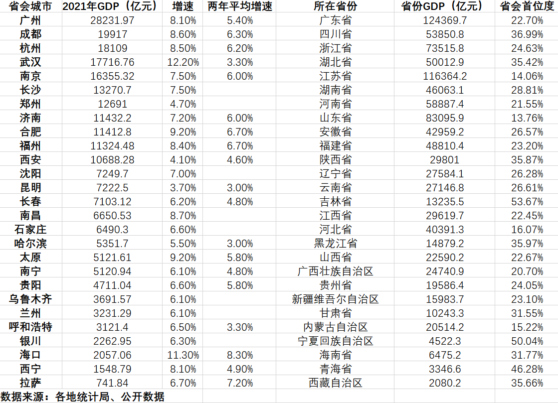 增速方面,考虑到2020年受疫情影响较大,因此,两年GDP平均增速更有衡量意义。在部分公布两年平均增速的省会城市中,海口、拉萨、福州、合肥、成都、杭州等城市位居前列。