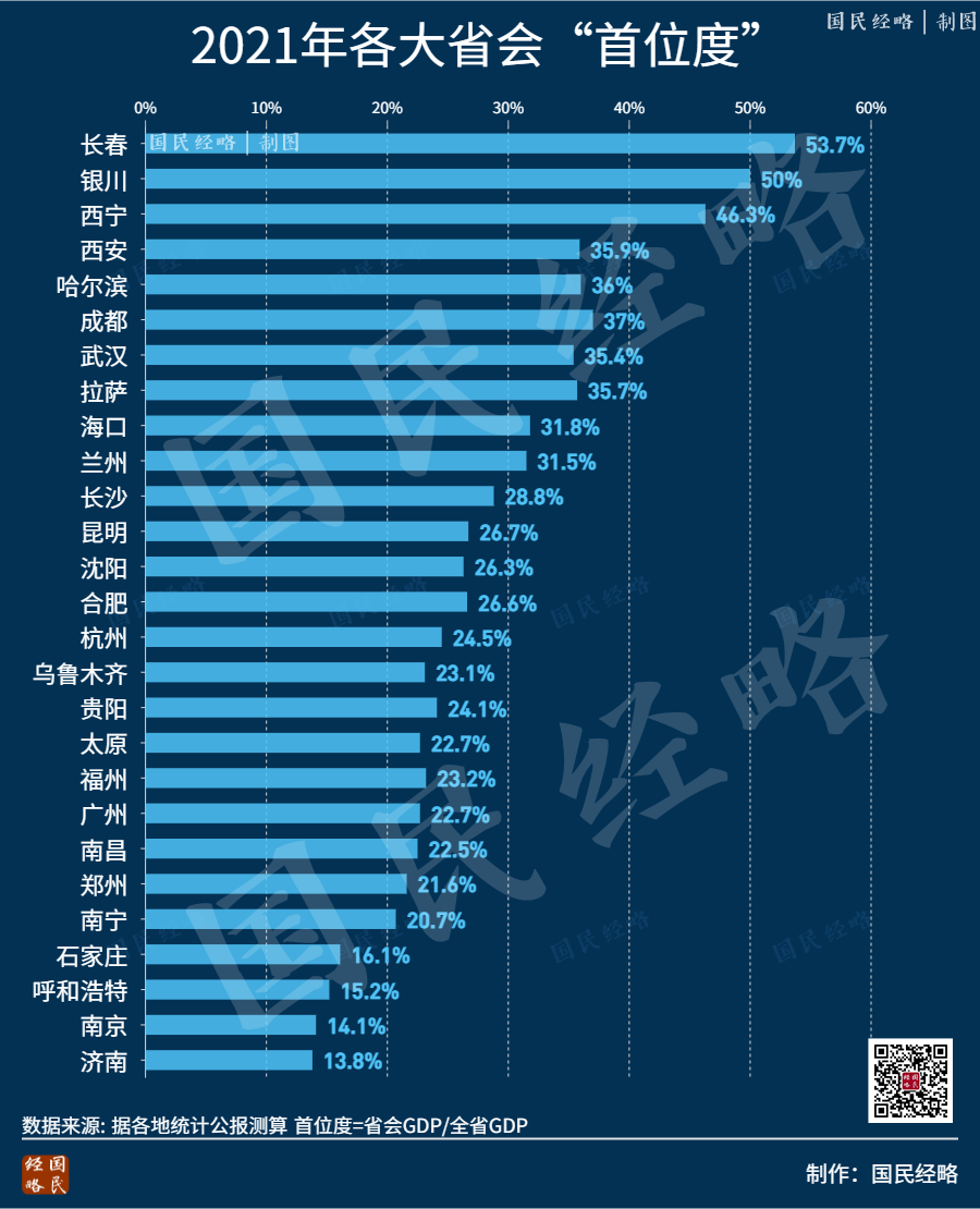 这一比例远远超过人们所熟知的三大强省会,成都、武汉、西安的经济首位度均不到40%。