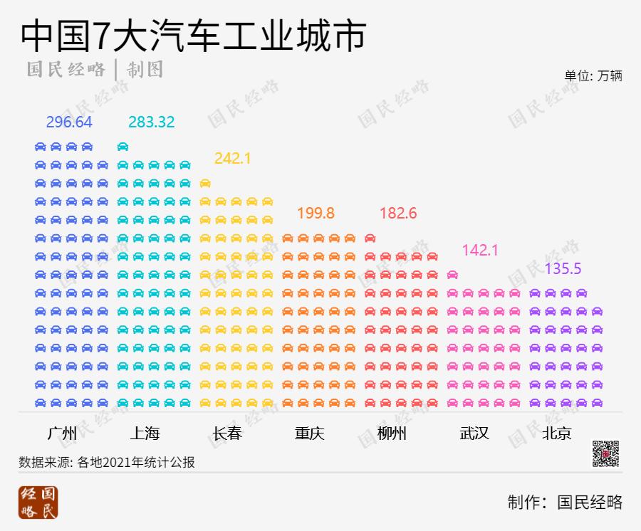 目前,我国有7个汽车年产量超百万的城市,只有广州、上海、长春三市超过200万辆,位居最前列。(参阅《》)