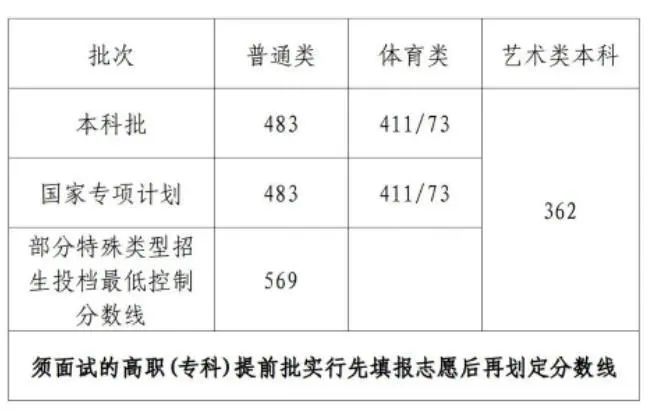 1.艺术类本科批文化课录取控制分数线:文艺 255 分,理艺 215 分。 2.艺术类高职(专科)批文化课录取控制分数线:文艺 150 分,理艺 150 分。 3.艺术类本科批专业课录取控制分数线:美术与设计学类 180 分,音乐学类 105 分,戏剧与影视学类 140 分,舞蹈学类 207 分,书法学专业 135 分。