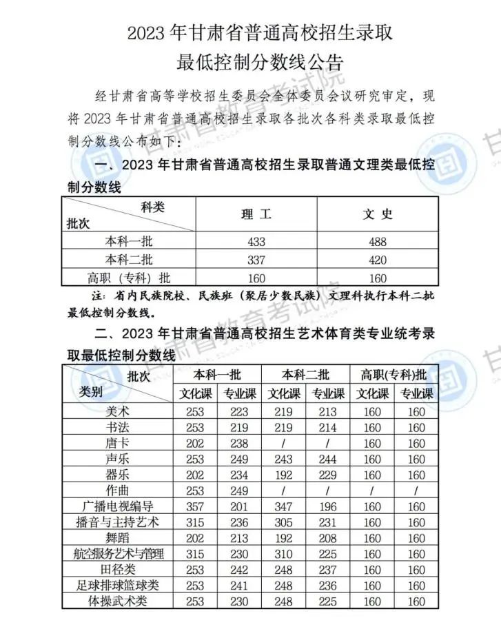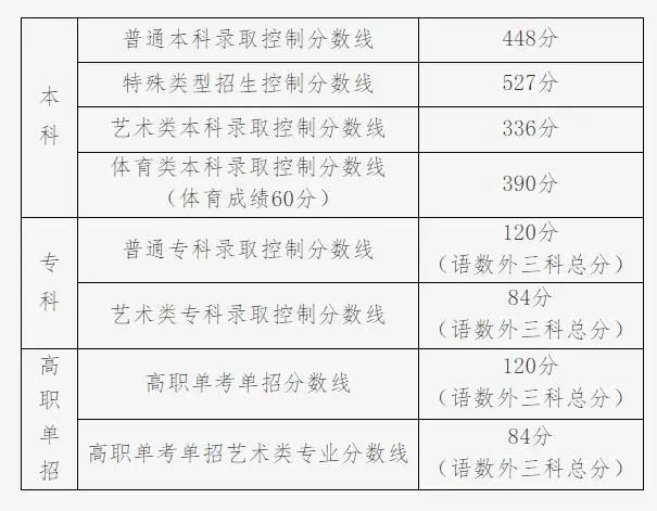 1.普通本科一批录取控制分数线:文史 430 分,理工 408 分。2.普通本科二批录取控制分数线:文史 341 分,理工 287 分。3.普通高职(专科)批录取控制分数线:文史 160 分,理工 160 分。