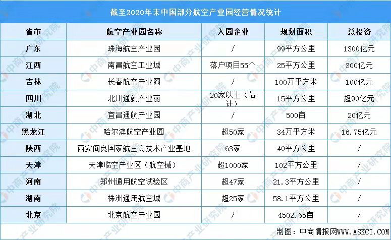 从经营情况来看,位于广东省的珠海航空产业园区总投资最高,达1300亿元,规划面积达99平方公里;其次为位于江西省的南昌航空工业城,总投资达300亿元,规划面积达25平方公里,目前落户项目达55个。