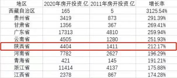楼 市 陕西十年房开投资增速超200%,居全国第6一般来说,固定资产中权重最大的三大块是工业投资、基建投资和房地产开发投资。其中在房地产开发投资方面,近年来随着区域楼市的分化,各地的房地产开发投资增速也出现分化。