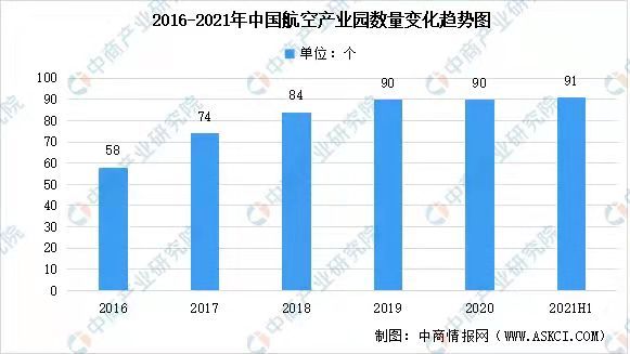 据中商产业研究院统计,我国航空产业园区数量呈增长趋势,由2016年58个增至2020年90个,年均复合增长率为11.6%,截至2021年上半年,我国航空产业园区数量达91个。