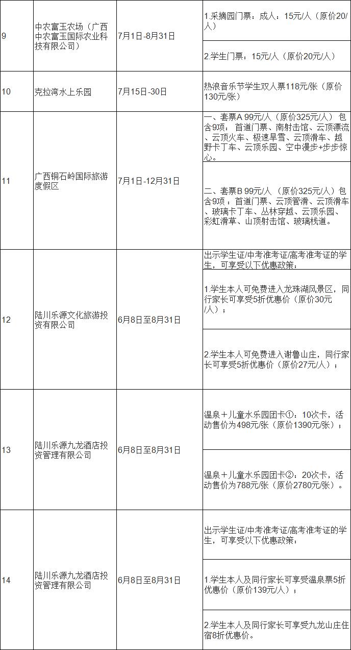 陆川乐源文化旅游投资有限公司推出优惠措施,即日起至8月31日,出示学生证/中考准考证/高考准考证的学生,可免费进入龙珠湖风景区和谢鲁山庄,同行家长可享受5折优惠价。