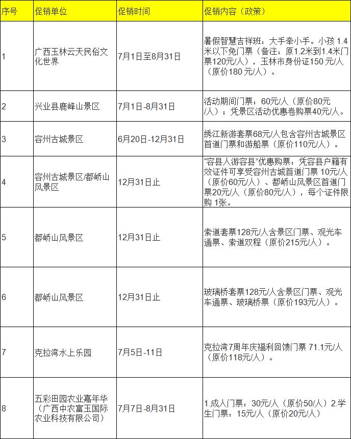 此外, 兴业县鹿峰山景区7月1日~8月31日期间门票为60元/人(原价80元/人);凭景区活动优惠卷购票40元/人。克拉湾水上乐园7月5日~11日推出克拉湾7周年庆福利回馈门票 71.1元/人(原价118元/人)。五彩田园农业嘉年华7月7日~8月31日成人门票为30元/人(原价50/人),学生门票为15元/人(原价20元/人)。