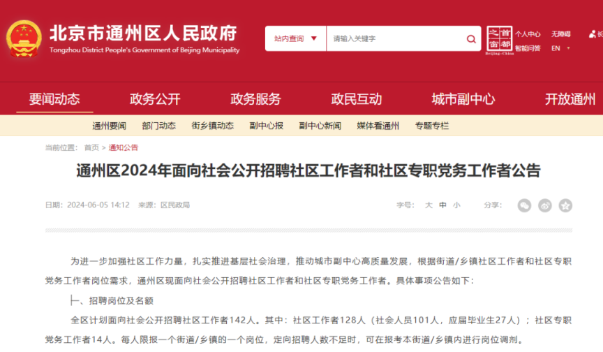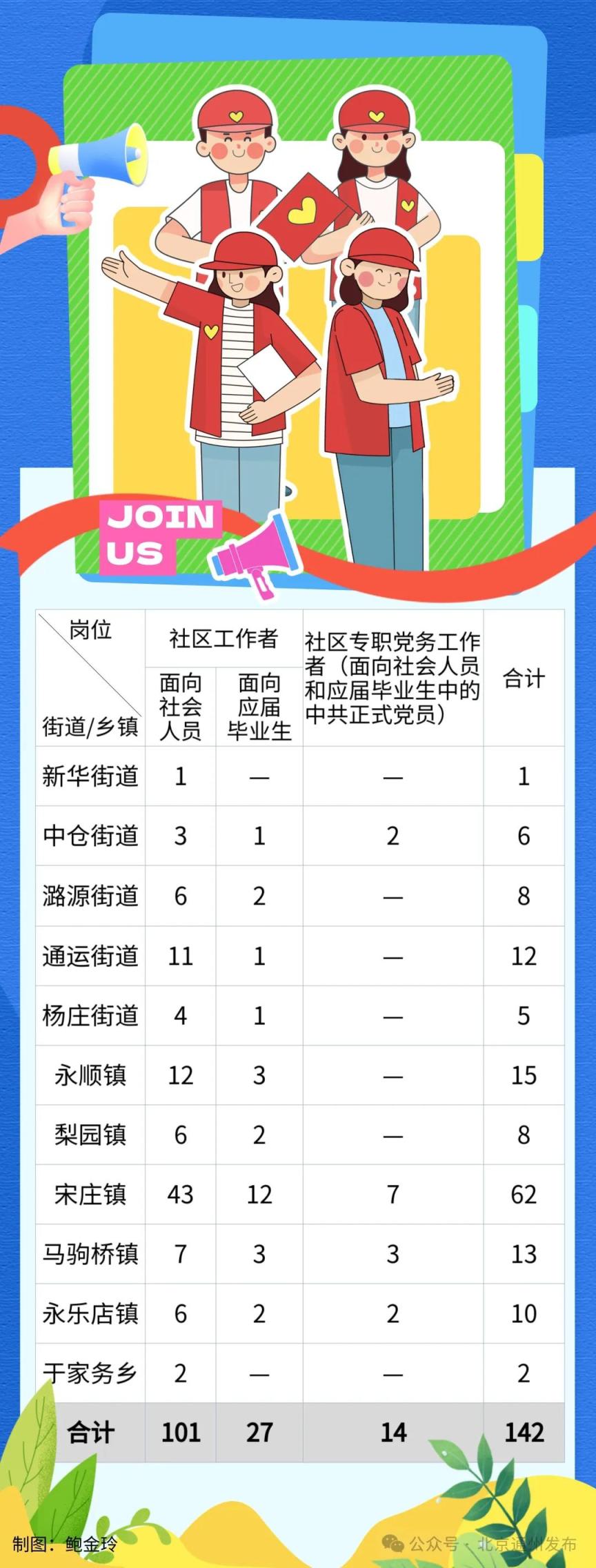 为进一步加强社区工作力量,扎实推进基层社会治理,推动副中心高质量发展,根据街道/乡镇社区工作者和社区专职党务工作者岗位需求,通州区现面向社会,公开招聘142名社区工作者和社区专职党务工作者。