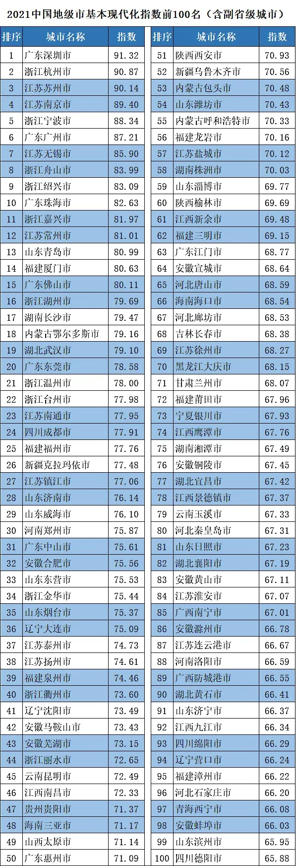 其中,广东深圳市基本现代化指数达91.32,列全国地级市第一位,浙江杭州市、江苏苏州市分列全国地级市第二、第三位。分区域看,中国地级市基本现代化指数前100名东部地区54个、中部地区23个、西部地区18个、东北地区5个,东部地区数量占到了一半以上;分省看,江苏以12个居首,浙江11个、山东10个,分列全国第二、第三位。
