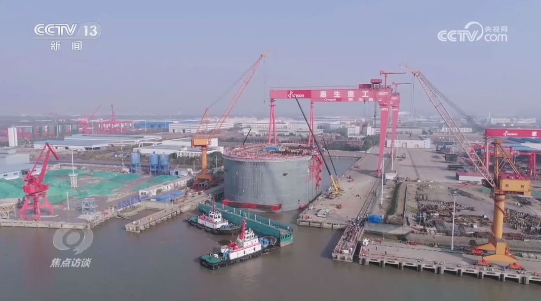 这是6号墩钢沉井,这个庞然大物在制造完成后,由拖船拖入长江航道、到达预定位置。