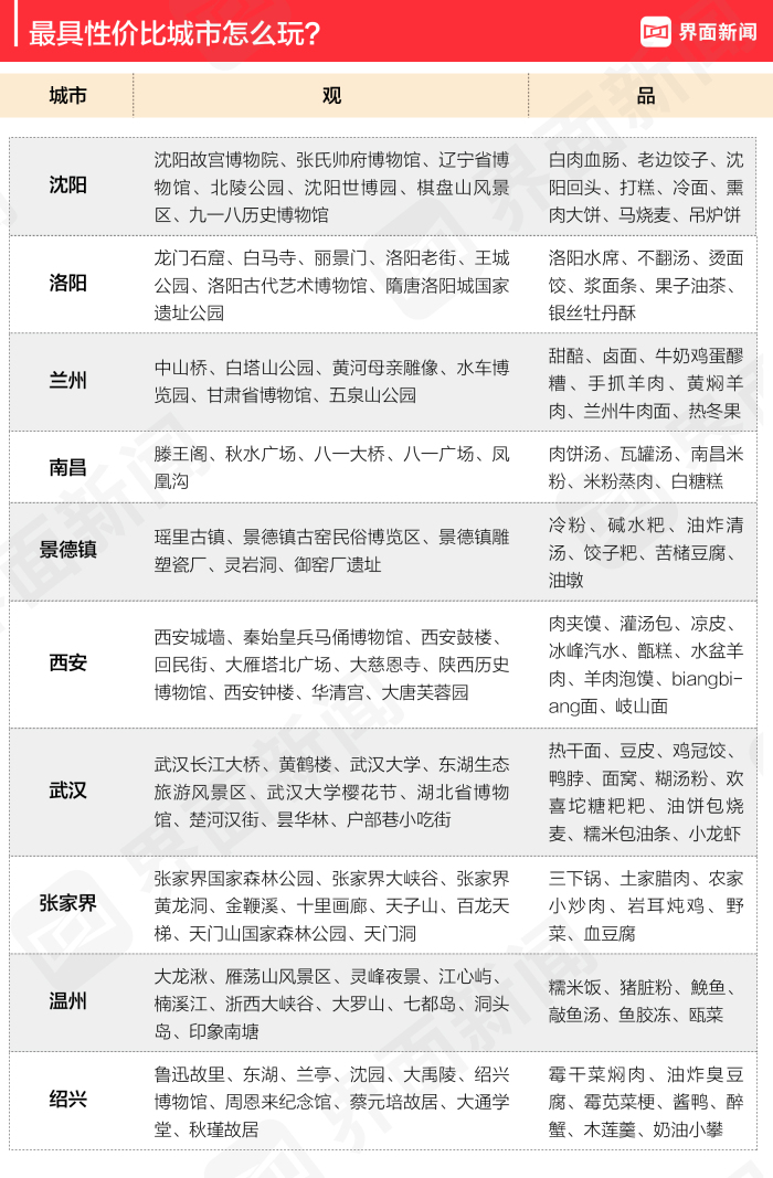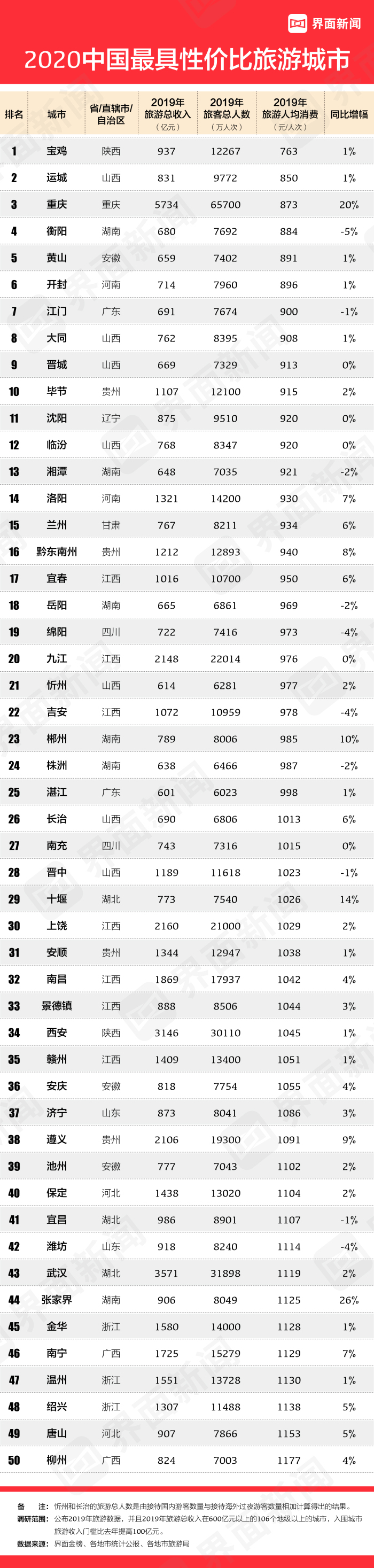随着国内疫情形势趋于稳定,各行各业逐渐走上了正轨。时间的指针已经悄然指向了2020的下半年。也许一直在家、精神紧绷的你,也在期待着来次痛快的旅行。为了让大家能有一场真正休憩身心的旅行体验,界面新闻今年再次推出2020中国最具性价比旅游城市榜单,为您的出行选择提供一份参考。