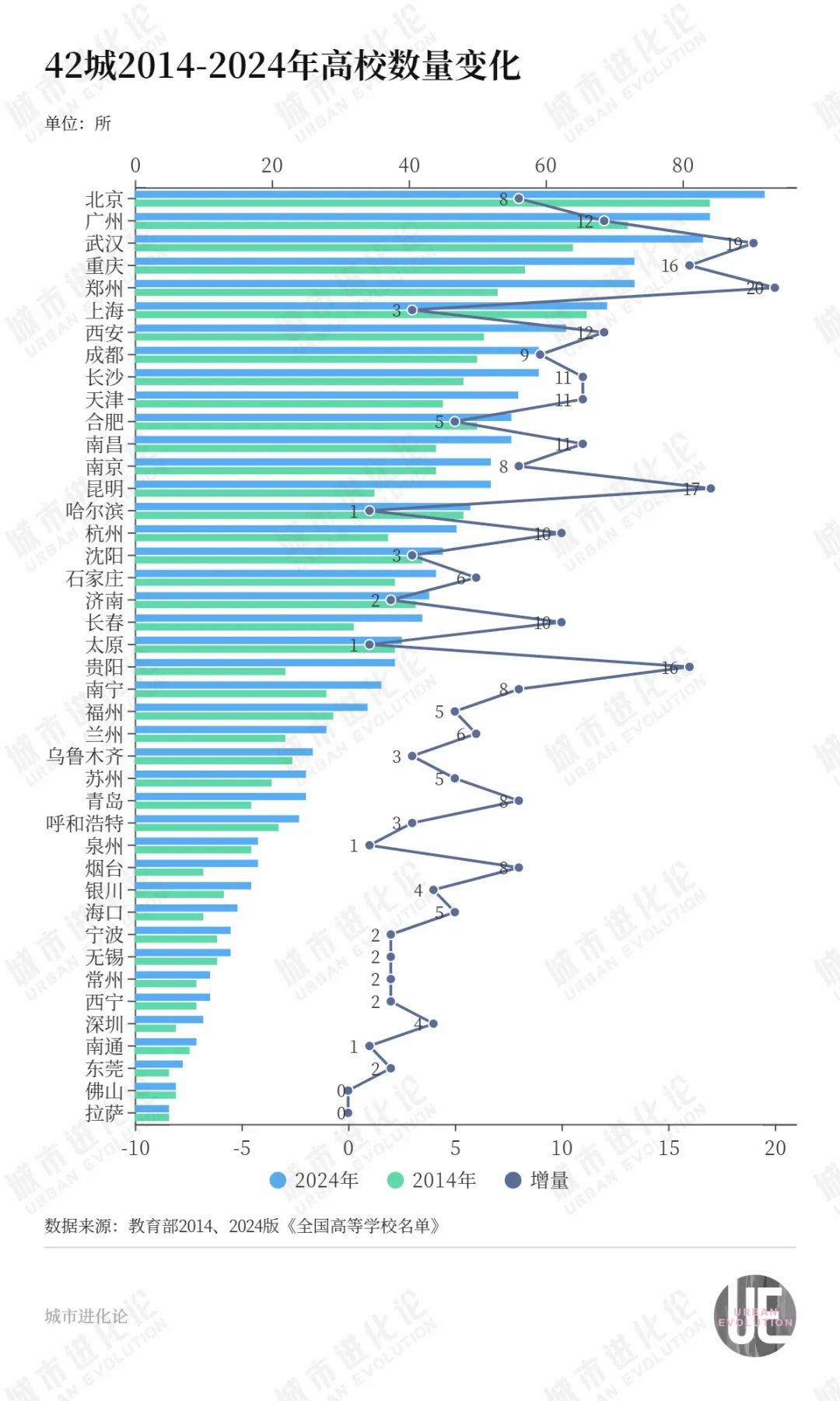 与此同时,武汉、昆明的高校数量分别增加19所、17所,重庆、贵阳各有16所,广州、西安、长沙、天津、南昌、杭州、长春等7城也有10余所高校“进账”。42座重点城市中,仅佛山和拉萨没有量上的增长。
