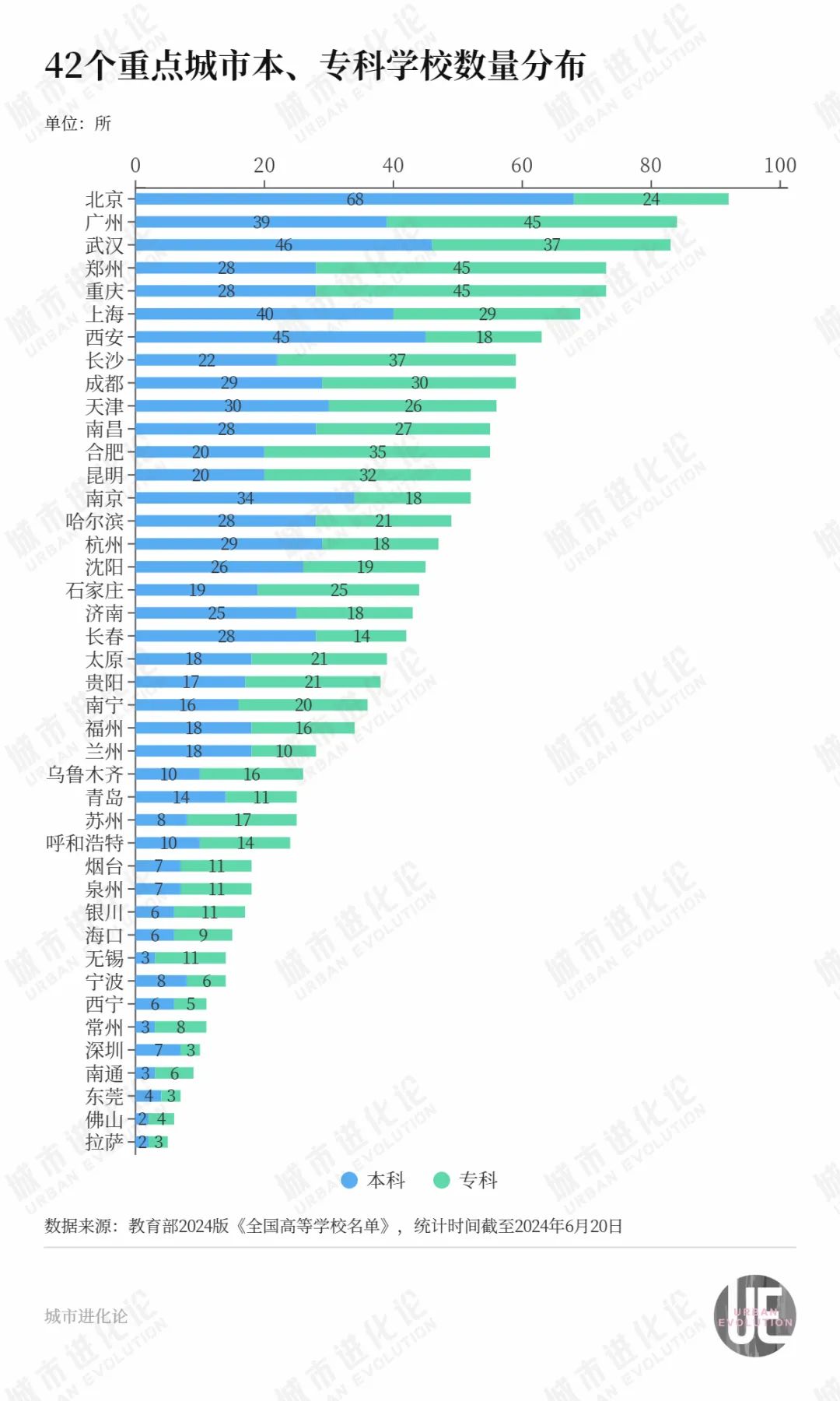 根据教育部最新公布的名单,42座重点城市(直辖市、省会城市和经济大市)集聚了全国半数高校(不含港澳台地区高校),其中本科学校超过6成——
