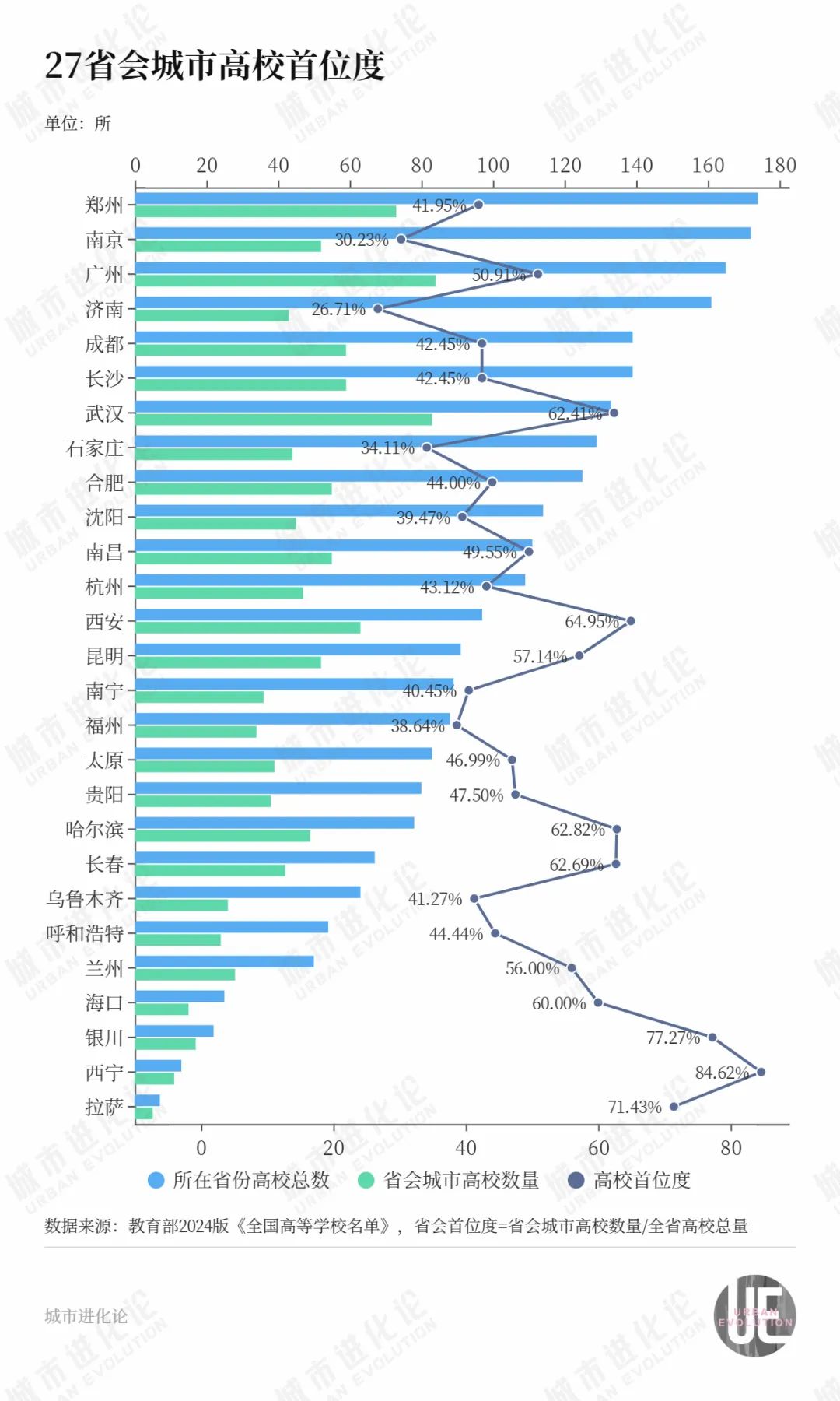 西安、哈尔滨、长春、武汉等老牌高教重镇的“高校首位度”保持在60%以上;