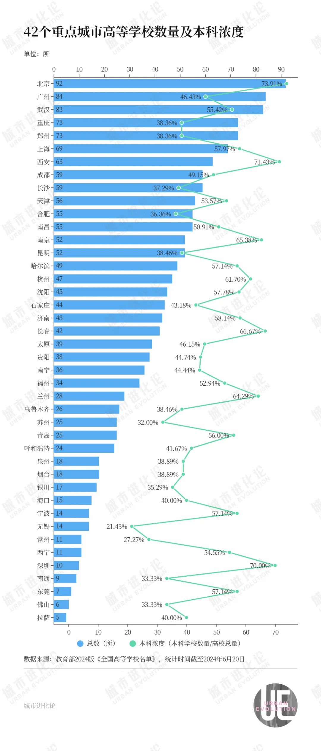 与之形成鲜明对照的是,一向在高教榜上不具优势的深圳,高校总量只有10所,在42座重点城市中排名第38位,但“本科浓度”高达70%,仅次于老牌高教重镇北京(73.9%)和西安(71.4%)。