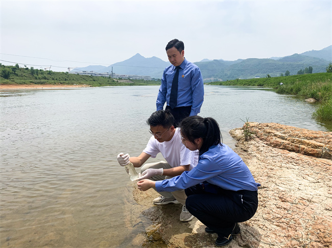 2023年5月,陕西省安康市汉滨区检察院检察官邀请环保组织专业人员对汉江水质进行取样检测。