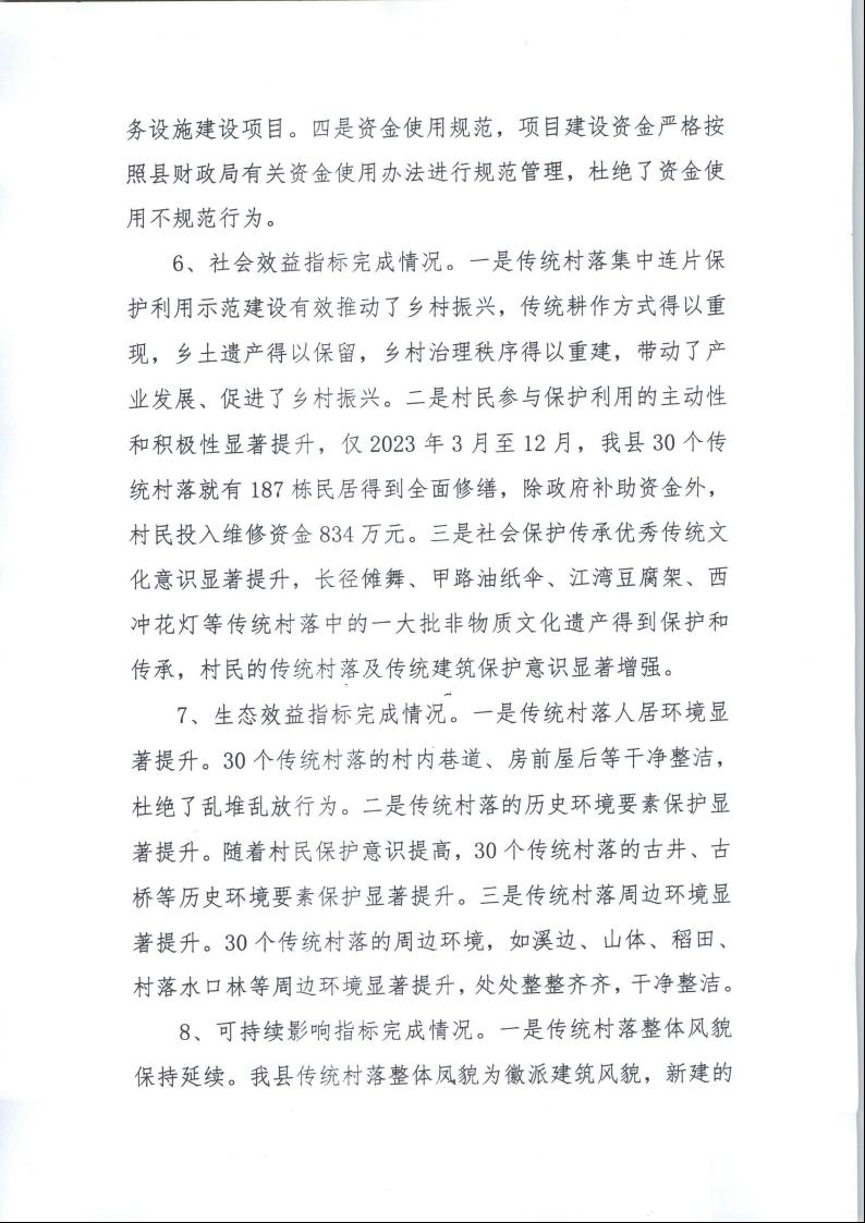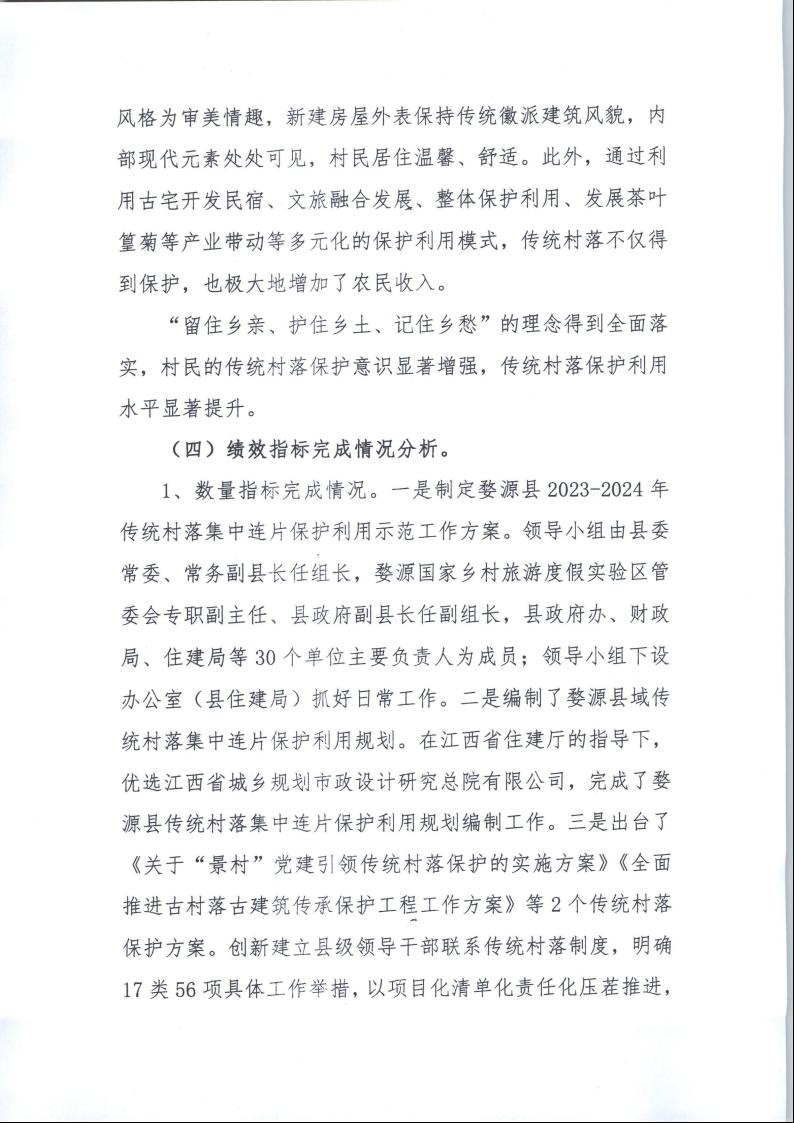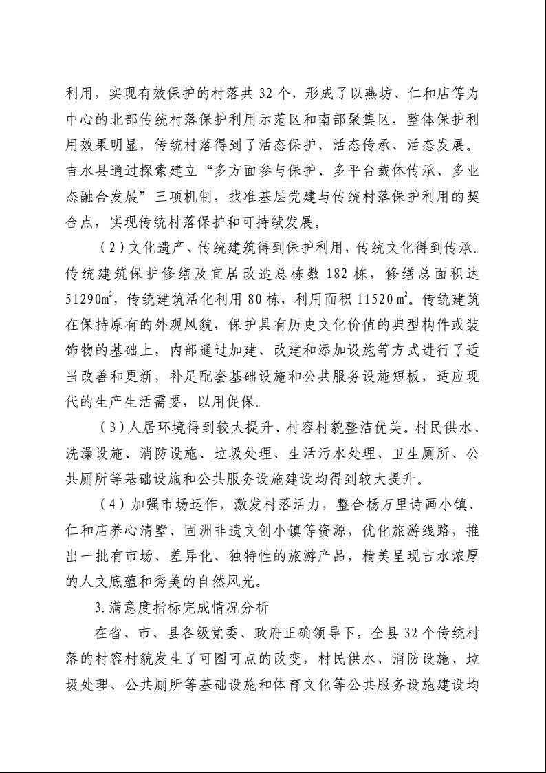 (四)绩效指标完成情况分析。数量指标。建设国家级传统村落集中连片保护利用示范县(市)3个。实施基础设施与环境卫生建设项目(含道路交通、水电基础、环境卫生、标识系统等)122个,实施公共服务设施建设项目(含旅游服务、文化活动等)49个,实施安防消防设施及历史环境要素、遗存修复、景观提升、产业发展项目149个。婺源县制定县域传统村落集中连片保护利用工作方案和县域传统村落集中连片保护利用规划,出台制度措施(长效机制)2个。3个示范县实施传统村落集中连片示范的中国传统村落数量共有57个。质量指标。示范县村落传统格局得到保护提升的村落比例达93%,村落垃圾污水处理等基础设施得到大幅提升的村落比例达100%,各示范县传统民居现代居住条件均有所提升,村容村貌显著改善,保护利用项目工程质量合格。时效指标。专项资金按要求及时下达。经济效益指标。带动地方配套资金及社会投资2.5亿元。社会效益指标。传统村落集中连片保护利用示范项目有效推动地方乡村振兴,人居环境明显提升,传统村落周边环境和历史环境要素保护显著提升。生态效益指标。功能和景观方面均有良好成效、文化遗产、传统建筑、人居环境等方面得到较大提升,村落村貌整洁优美。可持续影响指标。建立长效工作机制和长效管理机制,构建农村人居环境5G+长效管护平台,将传统村落均纳入平台监管,实现传统村落规范化、制度化、长效化的“五位一体”村庄环境和保护利用长效管护。服务对象满意度指标。当地群众对实施集中连片保护利用成效的满意度为≥95%。