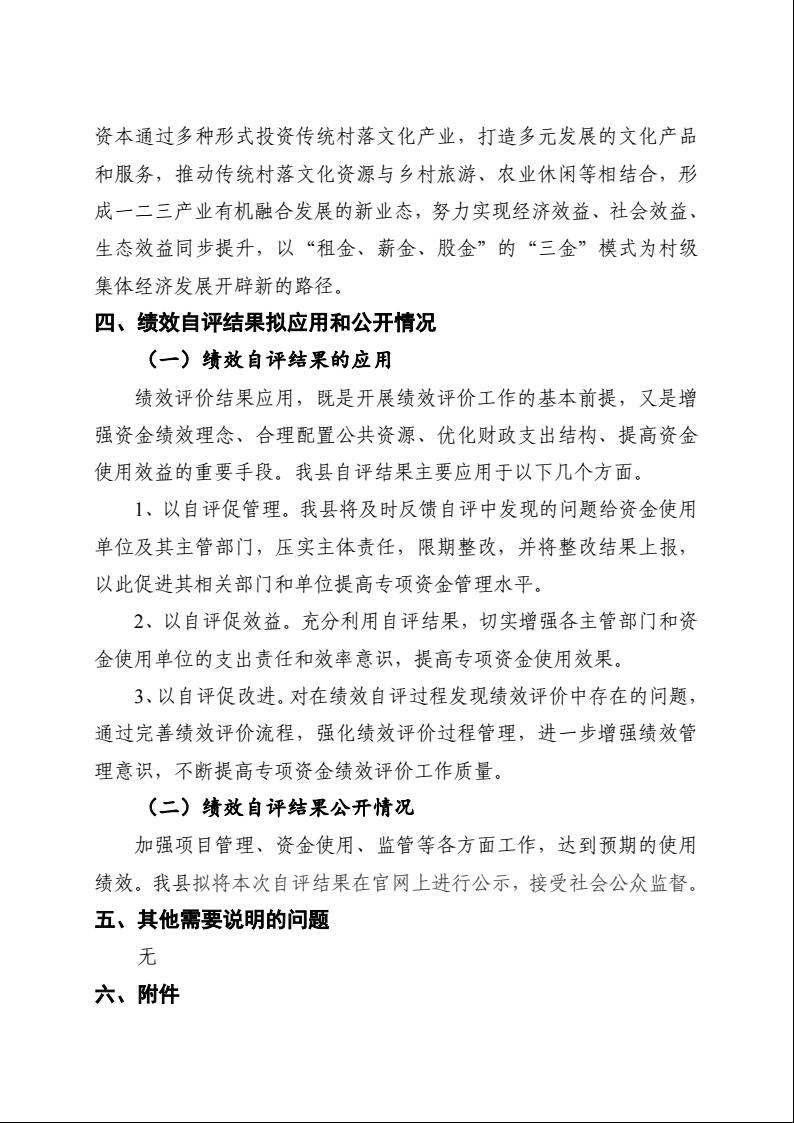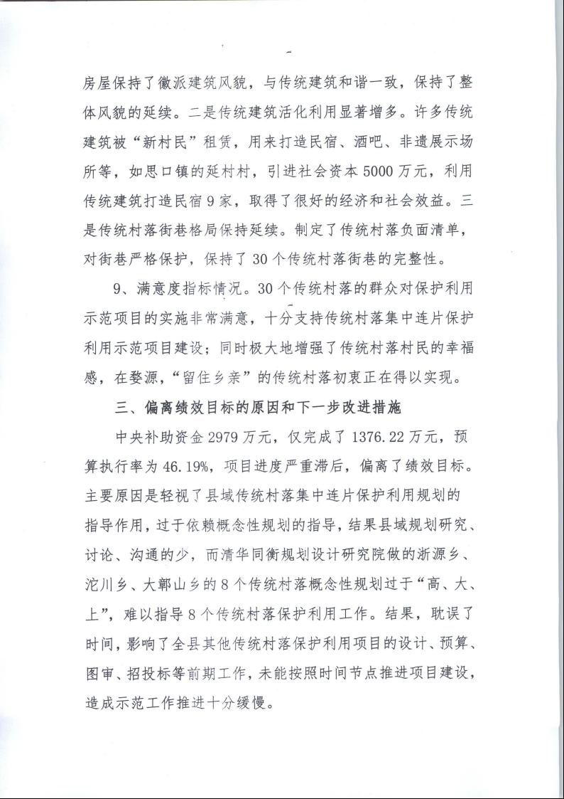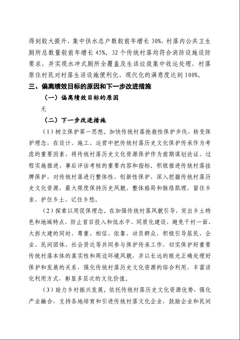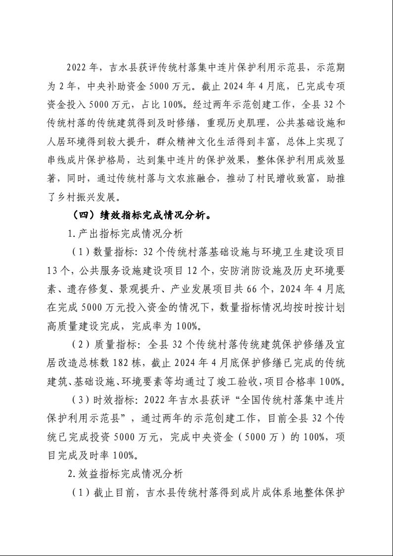 (四)绩效指标完成情况分析。数量指标。建设国家级传统村落集中连片保护利用示范县(市)3个。实施基础设施与环境卫生建设项目(含道路交通、水电基础、环境卫生、标识系统等)122个,实施公共服务设施建设项目(含旅游服务、文化活动等)49个,实施安防消防设施及历史环境要素、遗存修复、景观提升、产业发展项目149个。婺源县制定县域传统村落集中连片保护利用工作方案和县域传统村落集中连片保护利用规划,出台制度措施(长效机制)2个。3个示范县实施传统村落集中连片示范的中国传统村落数量共有57个。质量指标。示范县村落传统格局得到保护提升的村落比例达93%,村落垃圾污水处理等基础设施得到大幅提升的村落比例达100%,各示范县传统民居现代居住条件均有所提升,村容村貌显著改善,保护利用项目工程质量合格。时效指标。专项资金按要求及时下达。经济效益指标。带动地方配套资金及社会投资2.5亿元。社会效益指标。传统村落集中连片保护利用示范项目有效推动地方乡村振兴,人居环境明显提升,传统村落周边环境和历史环境要素保护显著提升。生态效益指标。功能和景观方面均有良好成效、文化遗产、传统建筑、人居环境等方面得到较大提升,村落村貌整洁优美。可持续影响指标。建立长效工作机制和长效管理机制,构建农村人居环境5G+长效管护平台,将传统村落均纳入平台监管,实现传统村落规范化、制度化、长效化的“五位一体”村庄环境和保护利用长效管护。服务对象满意度指标。当地群众对实施集中连片保护利用成效的满意度为≥95%。