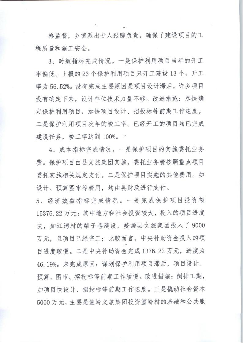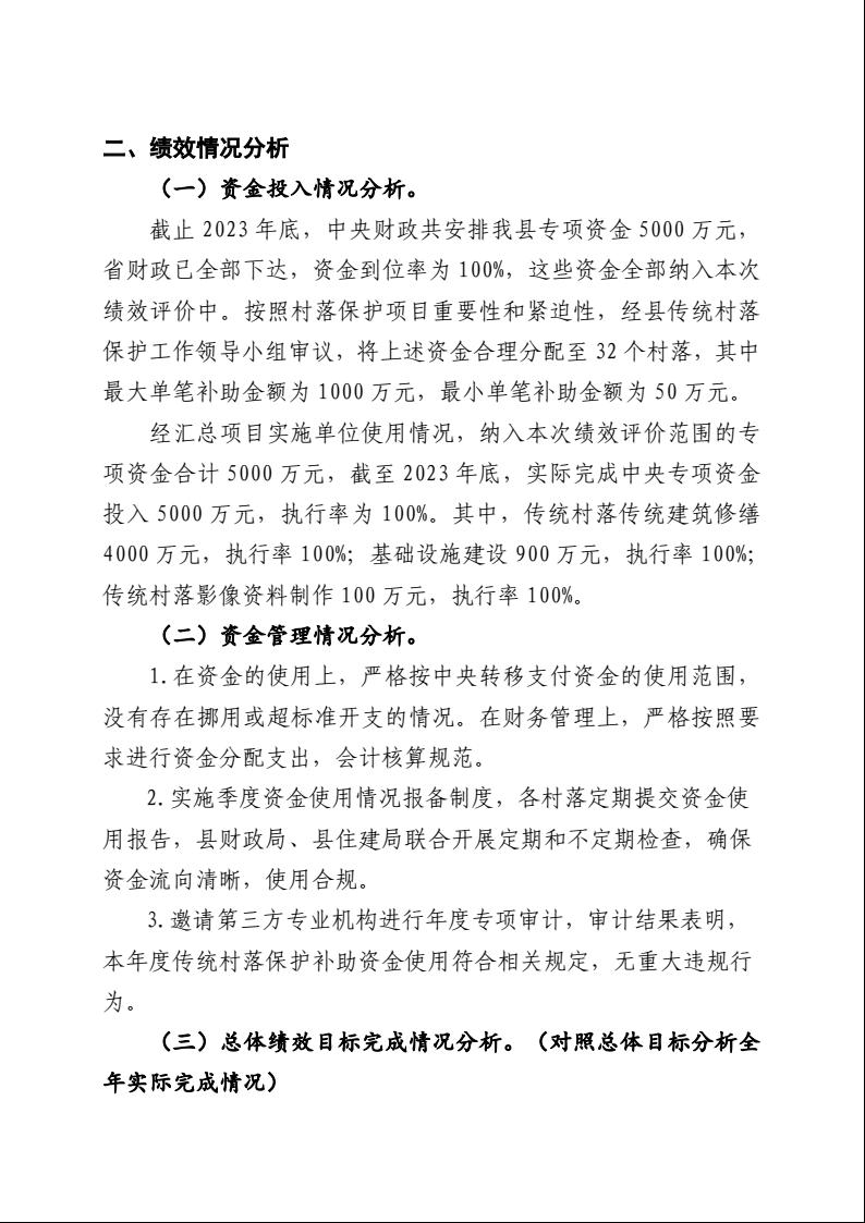(二)资金管理情况分析。省、市财政部门在规定时间内完成资金预算指标下达,并同时下达年度预算绩效目标。各示范县严格按要求将中央财政补助资金主要用于传统村落基础设施改造、公共服务设施改造和传统建筑修缮保护等方面。资金拨付、使用合法合规、安全有效,巡视巡察、审计、财会监督工作中未发现违法违纪问题。