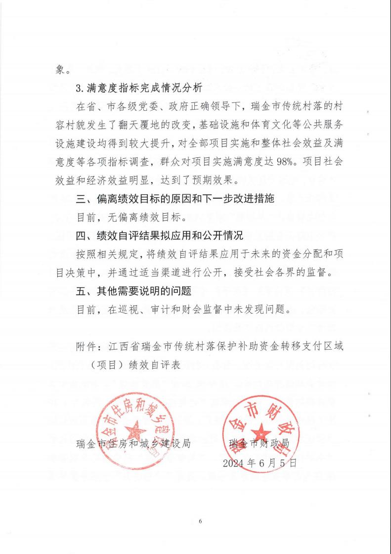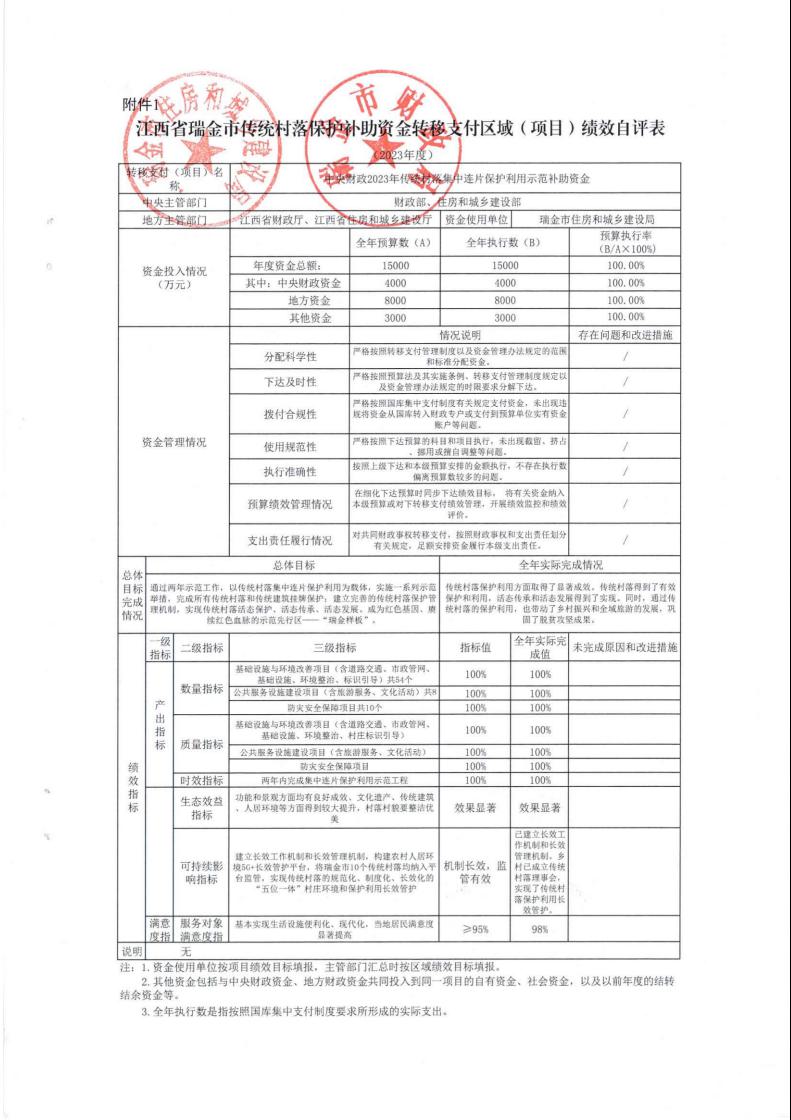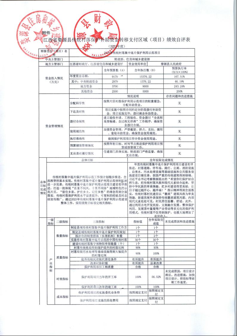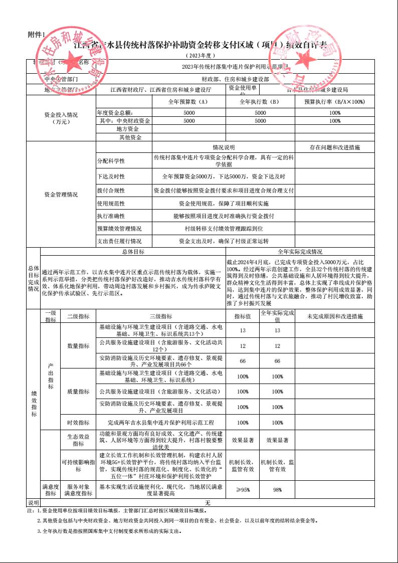 转移支付名称 传统村落保护补助资金(江西省) 中央主管部门 财政部、住房和城乡建设部 资金投入情况(万元) 年初预算数 全年预算数(A) 全年执行数(B) 分值 执行率(B/A×100%) 得分 年度资金总额: 29179 36979 35376.22 10 95.54% 8.66 其中:中央补助 11979 11979 10376.22 — 86.62% — 地方资金 11700 17000 17000 — 100.00% — 其他资金 5500 8000 8000 — 100.00% — 资金管理情况 情况说明 分值(40) 得分 存在问题和改进措施 分配科学性 科学合理 5 5 下达及时性 及时下达 5 5 拨付合规性 合规 5 5 使用规范性 合理使用 5 5 执行准确性 严格按照要求执行 5 5 预算绩效管理情况 全过程进行绩效管理 5 5 支出责任履行情况 严格按照资金管理制度执行 5 5 政策目标实现情况 按照实施方案执行 5 5 总体目标完成情况 总体目标 全年实际完成情况 以“留住乡亲、护住乡土、记住乡愁”为目标,稳步推进传统村落集中连片保护利用示范工作,进一步完善传统村落集中连片保护利用示范体制机制,传承当地特色传统文化,引导村庄建设风貌,发展村庄产业,改善村名居住条件,打造一批体现“百里不同风、十里不同俗”地域特色的示范片区,推动我省传统村落保护工作创新性发展,成为乡村振兴的样板之地。 江西省传统村落集中连片保护利用示范工作按计划稳步推进,全流程管控基本实现。传统村落集中连片保护利用示范体制机制进一步完善,传统村落集中连片保护利用示范项目建设有序推进,全面落实传统村落保护利用水平显著提升,基本完成了2023年度传统村落集中连片保护利用示范建设工作的既定目标。 绩效指标 一级指标 二级指标 三级指标 指标值 全年实际完成值 分值 得分 未完成原因和改进措施 数量指标 建设国家级传统村落集中连片保护利用示范县(市)(个) 3 3 2 2 制定县域传统村落集中连片保护利用工作方案 1个 1个 2 2 制定县域传统村落集中连片保护利用规划 1个 1个 2 2 拟出台的制度措施(长效机制)数量 1个 2个 2 2 实施传统村落集中连片示范的中国传统村落数量(个) ≥57个 57个 2 2 基础设施与环境卫生建设项目(含道路交通、水电基础、环境卫生、标识系统等) 67个 67个 2 2 公共服务设施建设项目(含旅游服务、文化活动等) 20个 20个 2 2 安防消防设施及历史环境要素、遗存修复、景观提升、产业发展项目 76个 76个 2 2 质量指标 村落传统格局得到保护提升的村落比例 90% 93% 1 1 村落垃圾污水处理等基础设施得到大幅提升的村落比例 95% 100% 1 1 提升传统民居现代居住条件 有所提升 有所提升 1 1 改善村容村貌 有所提升 显著改善 1 1 保护利用项目工程质量 合格 合格 1 1 时效指标 专项资金是否按时限要求下达 是 是 3 3 成本指标 保护利用项目的实施委托业务费 按照规定支付 按照规定支付 3 3 保护利用项目实施的其他费用 按照规定支付 按照规定支付 3 3 效益指标 经济效益指标 带动地方配套资金及社会投资(亿元) ≥1.72 2.5 2 2 资金使用规范 合格 合格 2 2 社会效益指标 传统村落人居环境 有所提升 显著提升 2 2 传统村落的历史环境要素保护 有所提升 显著提升 2 2 传统村落周边环境 有所提升 显著提升 2 2 生态效益指标 功能和景观方面均有良好成效、文化遗产、传统建筑、人居环境等方面得到较大提升,村落村貌要整洁优美 效果显著 效果显著 2 2 可持续影响指标 建立长效工作机制和长效管理机制,构建农村人居环境5G+长效管护平台,将传统村落均纳入平台监管,实现传统村落的规范化、制度化、长效化的“五位一体”村庄环境和保护利用长效管护。 机制长效,监管有效 机制长效,监管有效 3 3 满意度指标 服务对象满意度指标 群众满意度 ≥93% ≥95% 5 5 总分 100 98.66 说明 无。 注: 1.其他资金包括和中央财政资金、地方财政资金共同投入的自有资金、社会资金,以及以前年度的结转结余资金等。 2.资金管理情况需汇总反映各级政府的资金管理情况,对违反预算管理规定行为的,原则上每发现1例扣0.5分,扣完为止。 3.专项转移支付无需填写“支出责任履行情况”项,相关分值(5分)分摊到“分配科学性”、“下达及时性”、“拨付合规性”、“使用规范性”和“政策目标实现情况”等5项上。 4.原则上,一级指标分值设置为:资金投入情况10分、资金管理情况40分、产出指标30分、效益指标15分、满意度指标5分。如有特殊情况,除资金投入情况、资金管理情况外,其他指标分值权重可适当调整(总分应为100分)。巡视、审计和财会监督中发现问题的应酌情扣分。