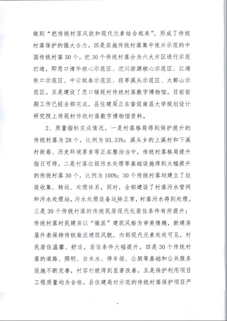 (三)区域绩效目标情况。吉水县、瑞金市基本完成示范工作计划。婺源县深入贯彻落实习近平总书记考察婺源时提出的“把传统村落风貌和现代元素结合起来,坚持中华民族的审美情趣,把乡村建设得更美丽,让日子越过越开心、越幸福!”重要指示精神,传统村落村民建房以“徽派”建筑风格为审美情趣,新建房屋外表保持传统徽派建筑风貌,内部现代元素处处可见,村民居住温馨、舒适。此外,通过利用古宅开发民宿、文旅融合发展、整体保护利用、发展茶叶篁菊等产业带动多元化的保护利用模式,不仅传统村落得到保护,也极大地增加了农民收入。