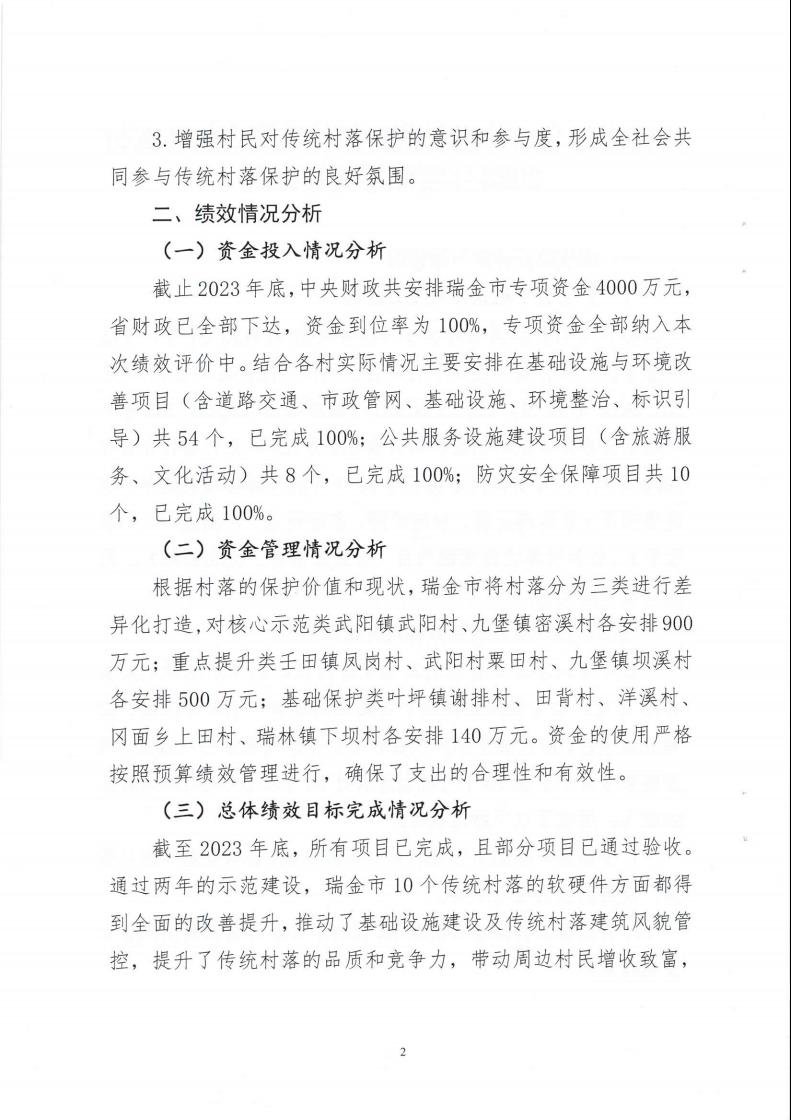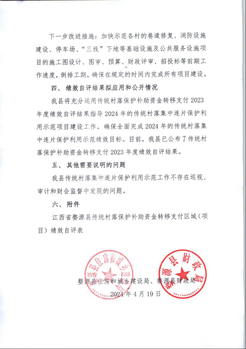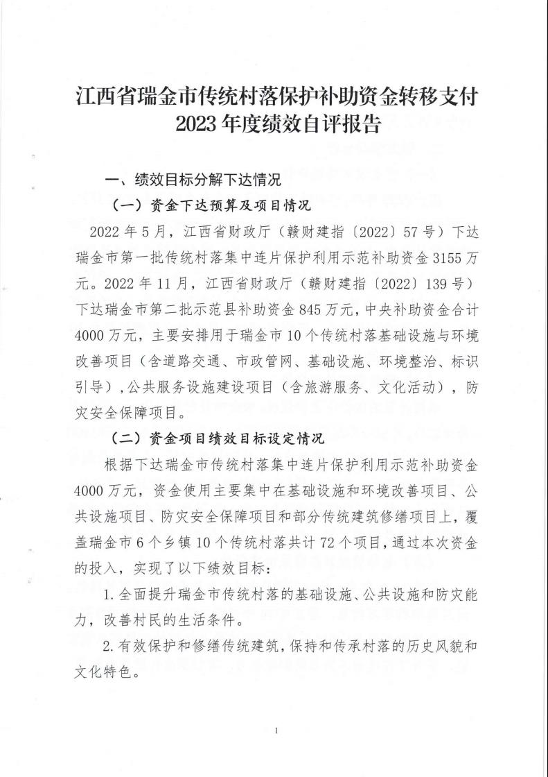 根据住房和城乡建设部办公厅、财政部办公厅《关于做好传统村落集中连片保护利用示范工作的通知》(建办村〔2023〕13号)要求,我省组织吉水县、瑞金市、婺源县等3个示范县(市)认真开展2023年度传统村落集中连片保护利用预算绩效管理及绩效目标实现情况分析。3个示范县(市)均按要求提交了自评报告(见附件)。现将有关情况报告如下。