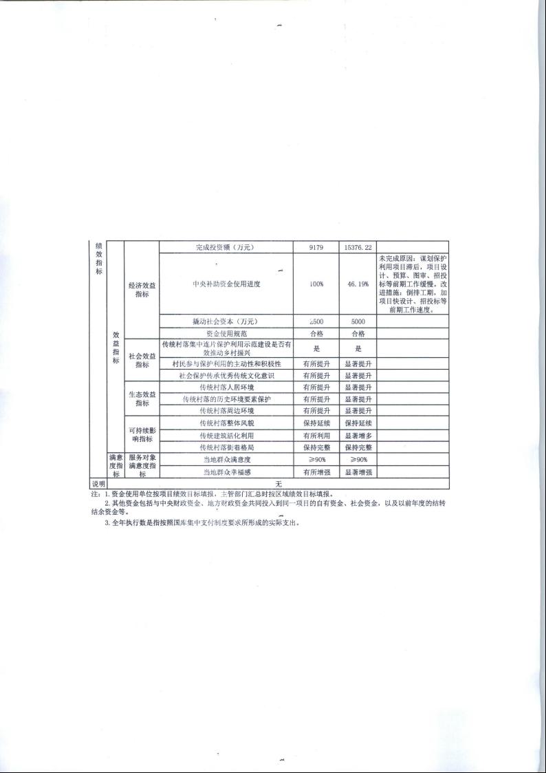 (二)整体绩效目标情况。以“留住乡亲、护住乡土、记住乡愁”为总体目标,示范县(市)稳步推进传统村落集中连片保护利用示范工作,进一步完善传统村落集中连片保护利用示范体制机制,传承当地特色传统文化,提升村庄建设风貌,发展乡村特色产业,改造村落基础设施和公共服务设施,改善村民居住条件,打造了一批体现“百里不同风、十里不同俗”地域特色的示范片区,推动了我省传统村落保护工作创新性发展,传统村落成为乡村振兴的样板之地。