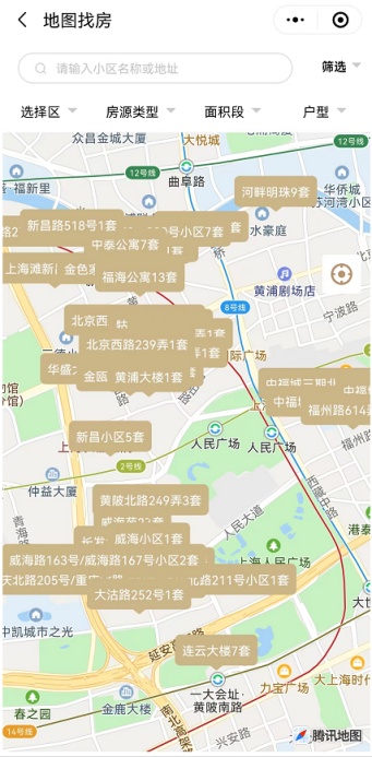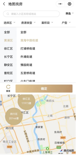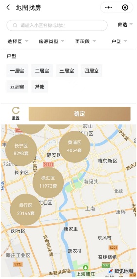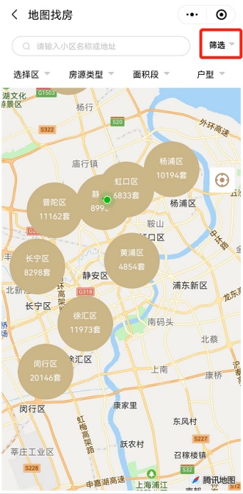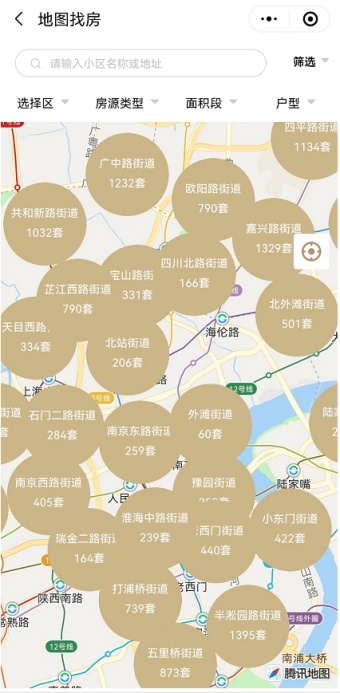 2、支持行政区、街镇、小区的地图筛选,可通过点击圆圈或放大缩小屏幕进行操作,查看相应范围内的房源数量与信息。
