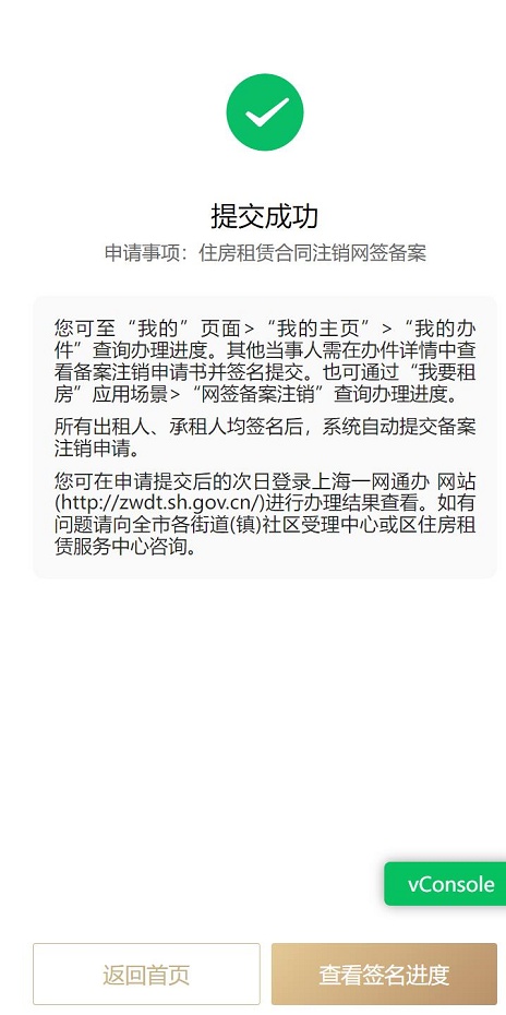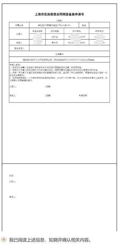 如需进行网签备案注销,可使用该服务。点击【申请注销】,选择【我已阅读…确认相关内容→下一步】确认注销申请书内容,签名后进行提交,其他当事人会收到手机短信和站内消息提示,他们全都签名确认后,注销就提交成功了。